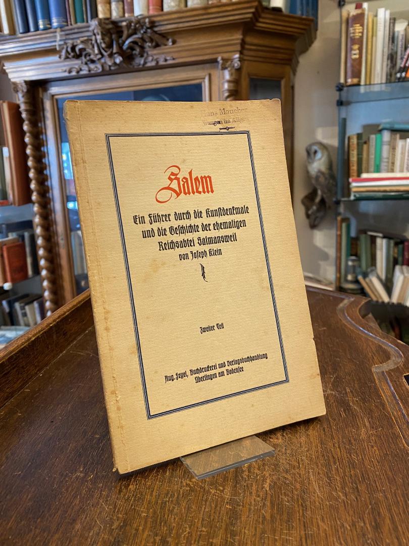 Salem. – Klein, Joseph: Salem : Ein Führer durch die Kunstdenkmale und die Geschichte der ehemaligen Reichsabtei Salmansweil : Zweiter Teil (mit Untertitel: Die Gedankenwelt der Münster-Innenausstattung). 2., veränderte Aufl., Teil 2 von 2, Überlingen, Aug. Feyel Verlagsbuchhandlung, 1927. 8° (22x15), 116 S., mit 8 TafelAbb., OKart (Brosch), angestaubt und teils etwas stockfleckig, Namensstempel auf Umschlag/Vorsatz/verso Frontispiz, ordentliches festes Exemplar,