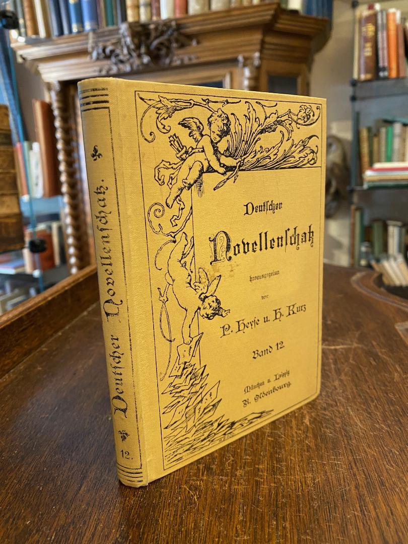 Deutscher Novellenschatz 12. – Heyse, Paul / Kurz, Hermann (Hrsg): Deutscher Novellenschatz : Zweite Serie – Sechster Band (Der ganzen Reihe zwölfter Band). Band 12 von 24, München, Rudolph Oldenbourg, [1871]. kl8° (17x12), 295 S., gelber ill Oln (Kaliko), dreiseitiger Rotschnitt, minimalst angeschmutzt, sauber und wohlerhalten, [= Deutscher Novellenschatz in 24 Bänden; 12 : herausgegeben von Paul Heyse und Hermann], Gestaltung: Verlagseinband: gelbes Kaliko – auf dem Vorderdeckel Titel und Bordüre mit Puttenmotiv, sign. M. Brod.; auf dem Hinterdeckel Vignette mit Puttenmotiv und Stempel: Buchbinderei R. Oldenbourg; auf dem Rücken Serientitel; Vorsätze mit Verlagswerbung mit Bordüren.–
