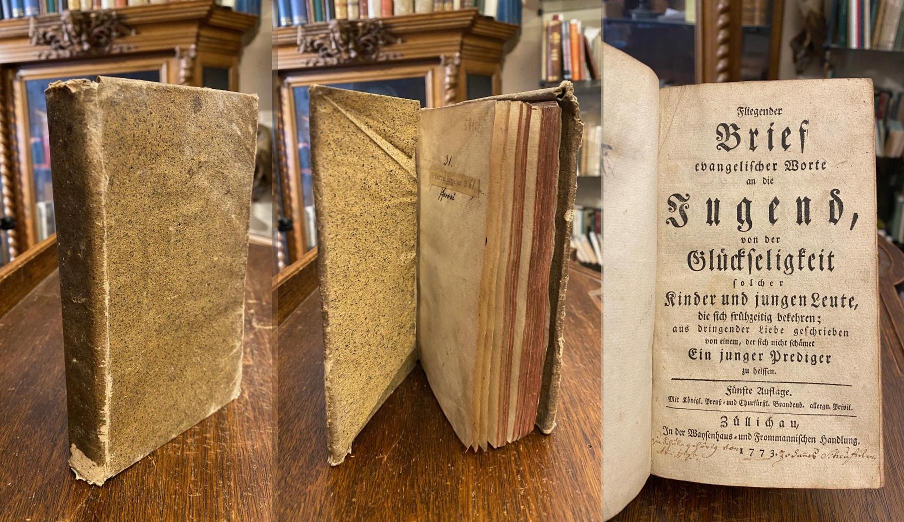 Woltersdorf, Ernst Gottlieb (1725–1761): Fliegender Brief evangelischer Worte an die Jugend, von der Glückseligkeit solcher Kinder und jungen Leute, die sich frühzeitig bekehren; aus dringender Liebe geschrieben von einem, der sich nicht schämet Ein junger Prediger zu heissen. 5. Aufl., Züllichau, In der Waysenhaus- und Frommann’ischen Handlung, 1773. 8° (18x11), 8 Bl., 304 S., mamor HPgmt d. Zt., obKapital mit Fehlstelle (wohl hungrige Mäuse), alt in Kleisterpapier eingeschlagen, zeitgenössischer Besitzvermerk am unteren Titelrand, Pfarrei-Inventar auf Vorsatz, gelegentlicher kleiner Eckknick oder Fingerfleckig, innen ordentliches Exemplar dieser frühen Ausgabe,