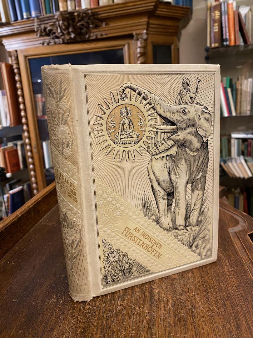 Ehlers, Otto E. (1855-1895): An indischen Fürstenhöfen : Erster Band. Mit Illustrationen. 4. Aufl., nur Band 1 von 2, Berlin, Allgemeiner Verein für Deutsche Literatur, 1895. 8° (22x15), 3 Bl., 412 S., 2 Bl., mit VerfasserPorträt und zahlr. fotograf Aufnahmen im Text und auf Tafeln, 1 eingefaltete Karten, heller Oln mit Deckelillustration in Reliefdruck, goldPrägung, dreiseitiger Rotschnitt, SchmuckVorsätze, der empfindliche Einband etwas angeschmutzt, Titelei und letztes Blatt etwas stockfleckig, moderner Name auf Titel, ein paar Lesespuren, ordentlich,