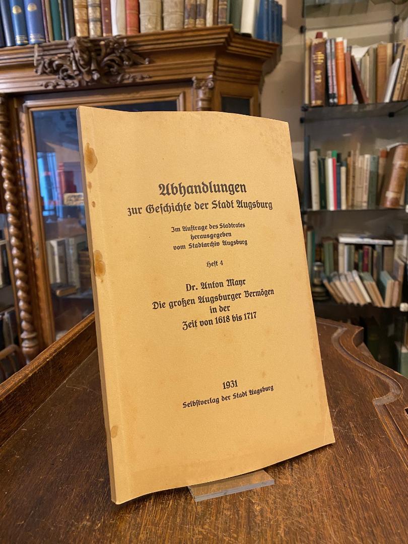 Augsburg. – Mayr, Anton: Die großen Augsburger Vermögen in der Zeit von 1618 bis 1717. Augsburg, Selbstverlag der Stadt Augsburg, 1931 gr8° (24x16), 127 S., OKart (Brosch), etwas angestaubt, Klammerbindung rostspurig, alter Stempel auf Titel/Innenspiegel (Bayer. Landesverein für Familienkunde e.V.), fest und sauber, [= Abhandlungen zur Geschichte der Stadt Augsburg; 4 : Im Auftrag des Stadtrates herausgegeben vom Stadtarchiv Augsburg],