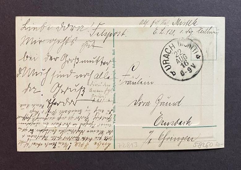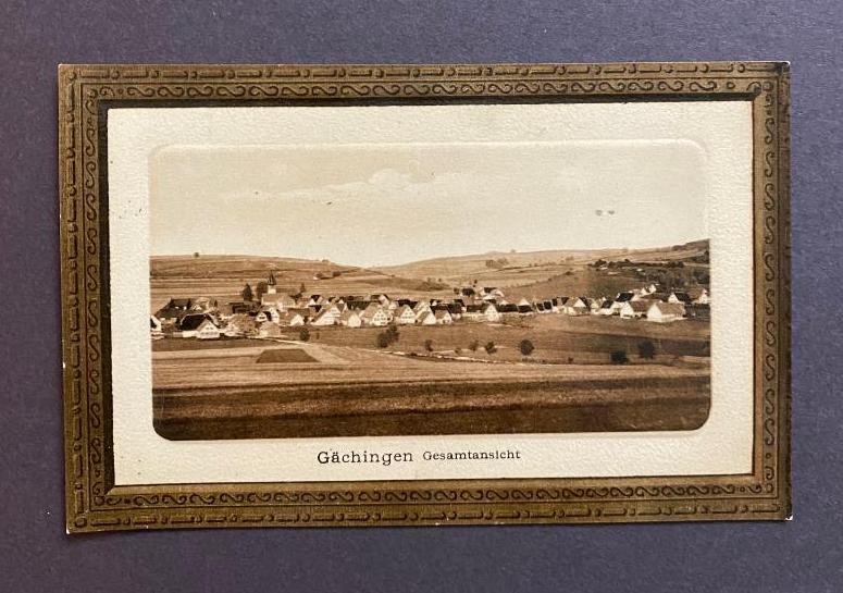 AK 72813 St. Johann – Gächingen Hall : Gächingen Gesamtansicht : Fotografische Gesamtansicht in brauntönen im Bilderrahmen – Reliefprägung – Hochglanzlack : gelaufen 22. August 1916. Schwäbisch Hall, Verlg Wilh. Klemm : Hofphotograph, [um 1910]. 12°quer (9x14),