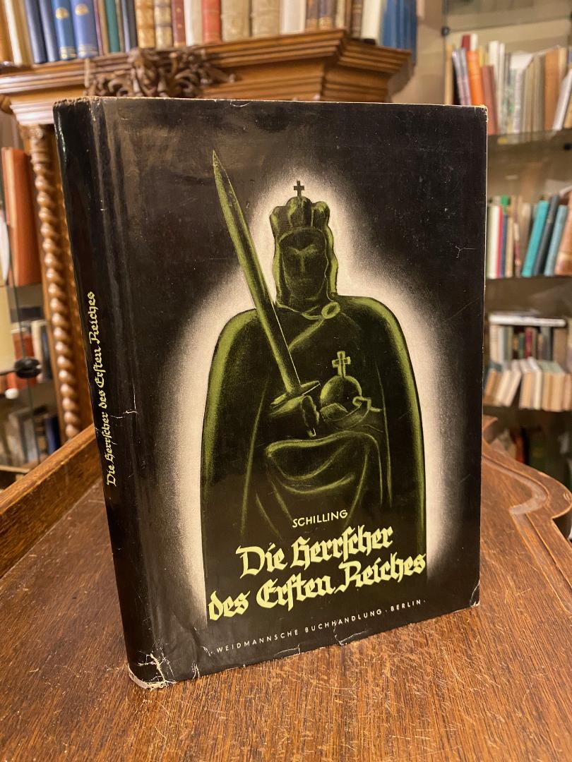 Schilling, Heinar (Heinrich): Die Herrscher des Ersten Reiches. Berlin, Weidmann’sche Buchhandlung, 1935. 8° (23x16), 167 S., mit zahlr. ganzseitigen Herrscherbildern, sowie genealosche Übersichten, OHln mit ill OU, Umschlag gering verletzt, ordentliches Exemplar, [= Heinar Schilling; Werk 74]. Die Königsbildnisse aus dem Römer in Frankfurt nach Holzschnitten von 1851, sowie ergänzt von Hans Schütz nach Münzen und Siegeln.–