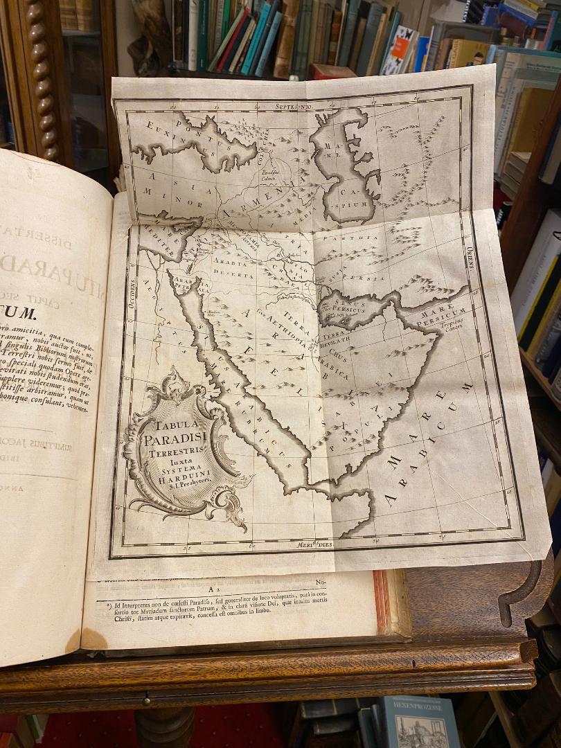 Bibel. – AT.– NT.– Ettenheimmünster Bibel. – Cartier, Germanus (1590-1749) (Hrsg): Biblia Sacra Vulgatae Editionis, Sixti V. Pontifi. Max. recognita, locupletibus SS. patrum et aliorum probatorum S. Scripturae interpretum commentariis illustrata. Una cum nova, eaque excultiore, nec non ad sensum Scripturae magis accommoda versione Germanica, in commodum et utilitatem totius ecclesiae Catholicae praesertim Germanicae elucubrata. A theologis Manasterii D. Ettonis prope S. Landelinum, vulgo Ettenheim-Münster ordinis S. Benedicti, sub directione P. Germani Cartier. Ibidem Professi, Capitularis, nec non SS. Theologiae, & SS. Canonum Professoris : TOM III/IV. Editio Secunda [2. Aufl.], 2 Bände (Band 3 und 4) in 1, Constantiae [Konstanz], Sumptibus Jacobi Friderici Bez & Sociorum [Jakob Friedrich Bez & Sohn Willibald], 1763. Folio (38x24), 1 Bl., 588 S., mit 6 Tafeln; 1 Bl., 12, 571, 1 ungez. gefaltete Karten-Tafel, 48, [52] S., mit 30 Tafeln, Schweinslederband d.Zt. mit Blindprägung, 2 verzierte Rückenschildern, dreiseitiger Rotschnitt, 2 Schließbänden (Metallverschluß fehlt), etwas Patina, alte Eintragung auf Innenspiegel, gutes gepflegtes und sauberes Exemplar, VD18 90738179 / 90738195.– auf Innenspiegel Besitzvermerk des Edmund Rein Mönch im Zisterzienser-Kloster Ebrach.–