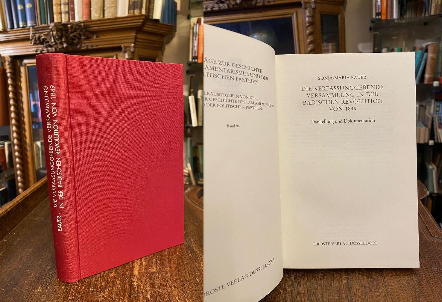 Bauer, Sonja-Maria: Die verfassunggebende Versammlung in der Badischen Revolution von 1849 : Darstellung und Dokumentation. Düsseldorf, Droste Verlag, (1991). 8° (23x16), 377 S., mit 2 Karten, 4 Tab. und 10 Abb., roter Oln mit Rückentitel ohne OU, kleiner Archivstempel auf Innenspiegel, wohl ungelesen, sauber und frisch, [= Beiträge zur Geschichte des Parlamentarismus und der politischen Parteien; 94 : herausgegeben von der Kommission für Geschichte des Parlamentarismus und der politischen Parteien],