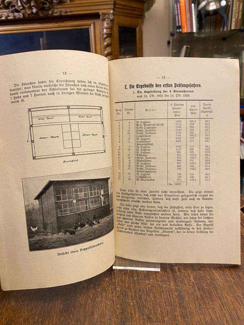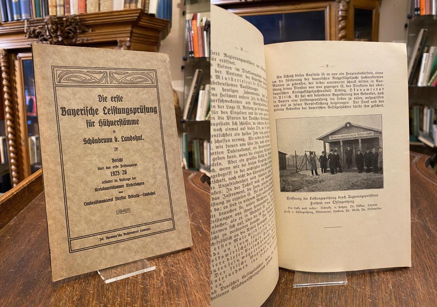 Nebesky, Dir.: Die erste Bayerische Leistungsprüfung für Hühnerstämme in Schönbrunn b. Landshut : Bericht über das erste Prüfungsjahr 1825/26 erstattet im Auftrage der Kreisbauernkammer Niederbayern von Landesökonomierat Direktor Nebesky, Landhut. Landshut, Jos. Thomann’sche Buchdruckerei, (1926). 8° (22x16), 56 S., mit fotograf Aufnahmen und graph. Darst., OKart (Brosch), sauber und wohlerhalten,
