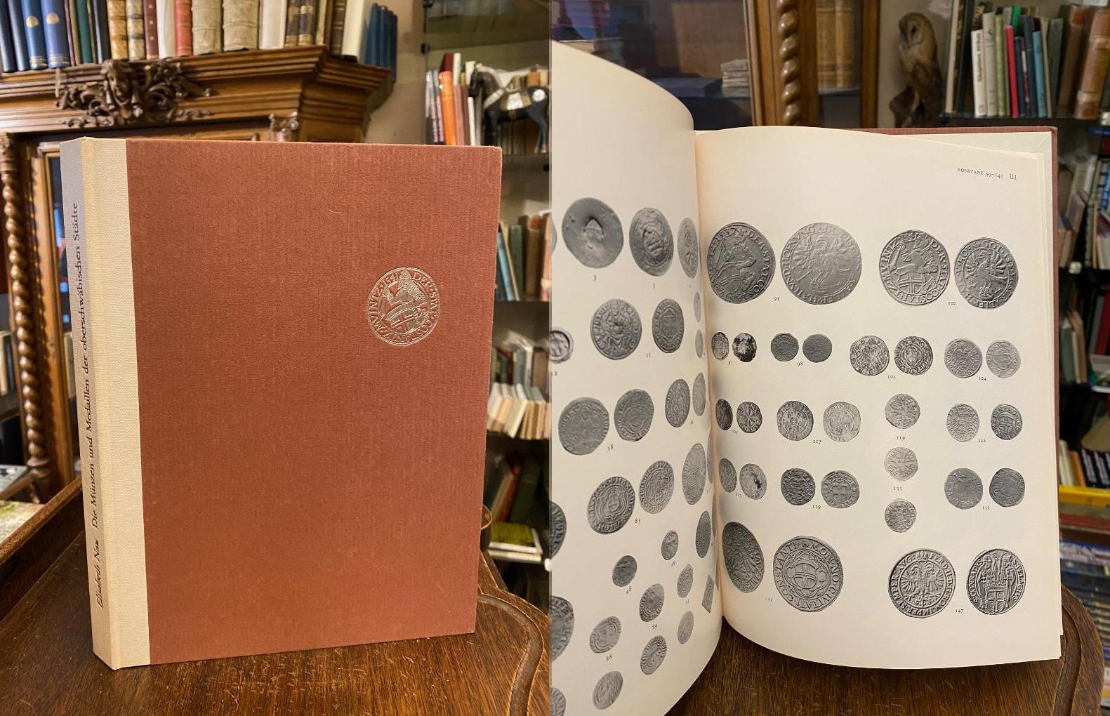 Nau, Elisabeth: Die Münzen und Medaillen der oberschwäbischen Städte. Freiburg, Kricheldorf Verlag, 1964. 4° (28x21), 4 Bl., 186, [36] S., mit 33 Münztafeln un 16 Städteansichten nach alten Stichen und Zeichnungen sowie Abbildung eines Glasfensters aus der ehemaligen Münze zu Kostanz, 1 Errata-Blatt, OHln mit silberPrägung auf Deckel und Rückentitel, nahezu ungenutzt, sehr schönes gepflegtes Exemplar, Standardwerk.–