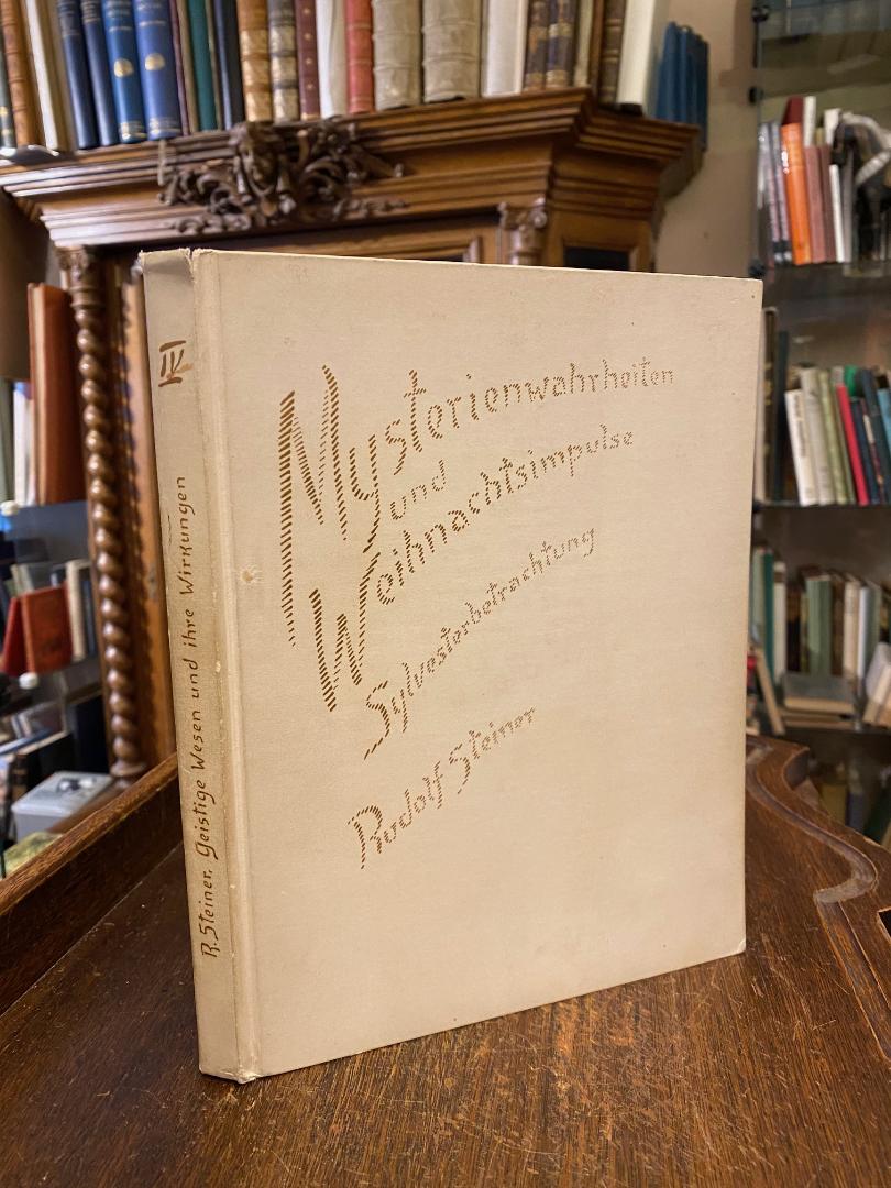 Steiner, Rudolf: Mysterienwahrheiten und Weihnachtsimpulse [und] (Sylvesterbetrachtung) : Sechs Vorträge von Rudold Steiner gehalten zwischen dem 24. und 31. Dezember 1917 in Dornach. Nach einer vom Vortragenden nich durchgesehenen Nachschrift von Marie Steiner. Dornach, Philosophisch-Anthroposophischer Verlag am Goetheanum, 1935. 4° (25x19), 4 Bl., 149 S., 1 Bl., heller OPbd mit goldTitel, etwas angestaubt, obKapitel gering verletzt, Titelblatt mit schwachem Namensstempel, gutes Exemplar, [= Geistige Wesen und ihre Wirkungen : Deren Spiegelung im irdischen Geschehen; 4],