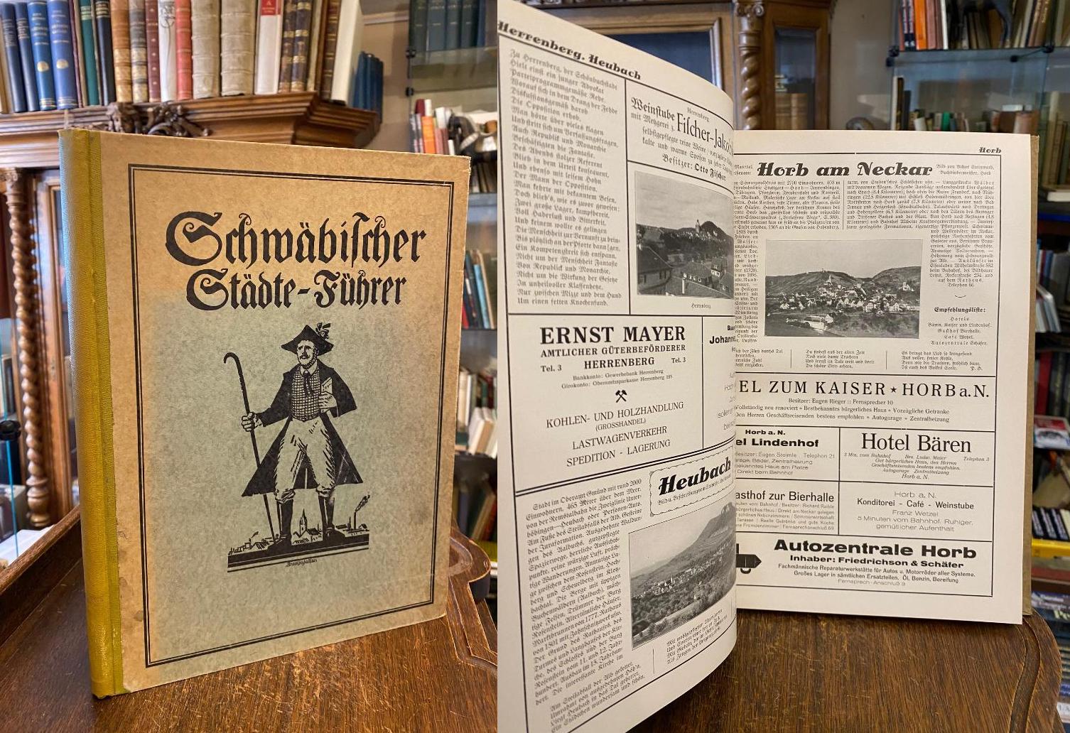 Hottmann, Paul : Hirsch Verlag Stuttgart (Hrsg): Schwäbischer Städteführer : Unter gütiger Mitarbeit von Gemeindeverwaltungen, Verkehrsvereinen usw. herausgegeben von Paul Hottmann, Hirschverlag, Stuttgart. Stuttgart, Furtbachdruck Holoch & Dietz, 1925. 4° (31x24), 115 Bl., reich illustriert mit fotograf Aufnahmen, Ortsbeschreibungen und reichlich Werbung, Übersichtskarte, ill OHln, Einband lichtverfärbt, gutes gepflegtes Exemplar, Einbandillustration von Rudolf Brackenhammer, Nürtingen.–