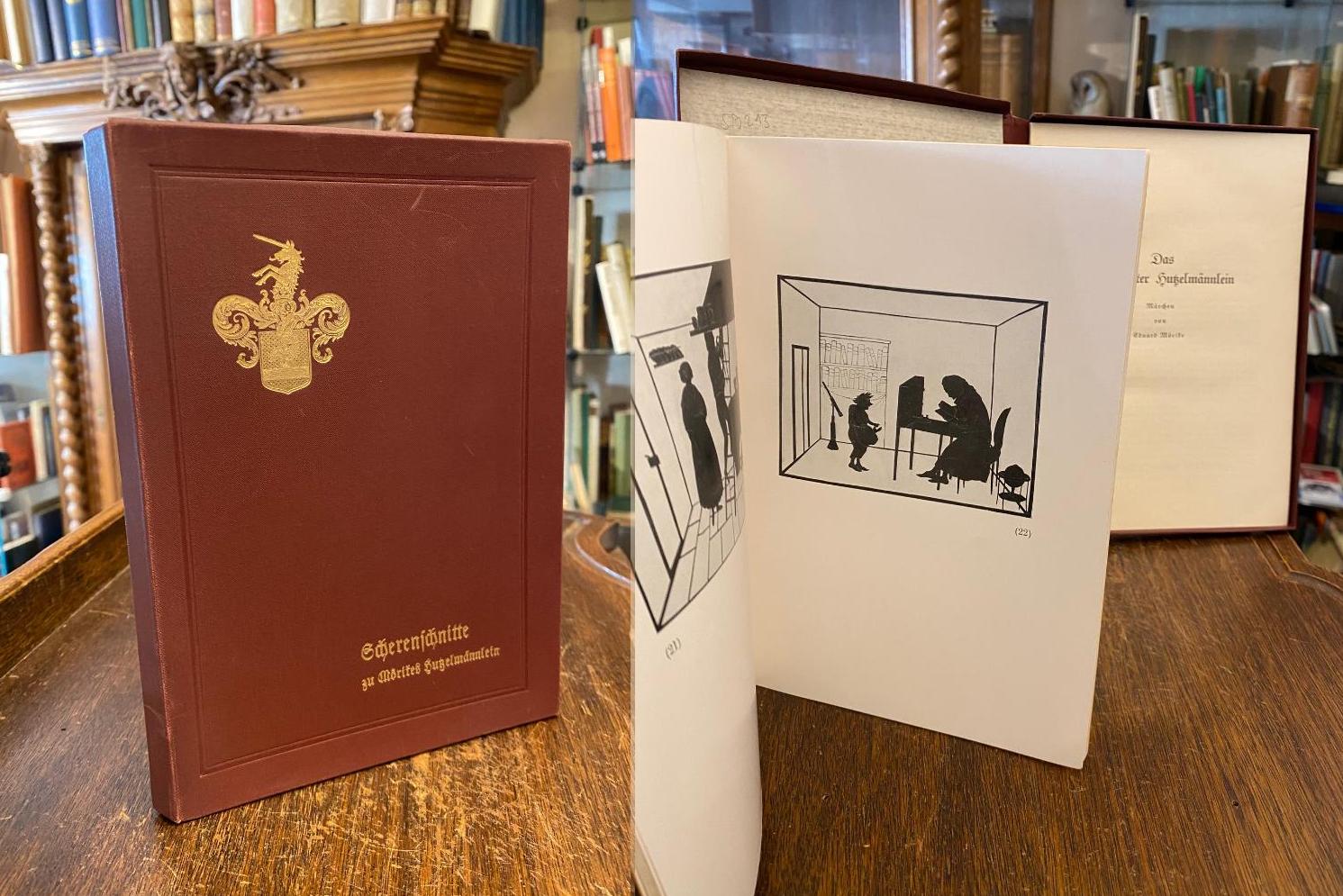 Mörike, Eduard. – Güntter, Otto (Hrsg): Die Scherenschnitte von Luise von Breitschwert zu Mörikes Stuttgarter Hutzelmännlein. Mit dem Text des Märchens. Stuttgart und Berlin, J. G. Cotta’sche Buchhandlung Nachf, 1932. 8° (21x15), Textheft: 62 S., + Tafel-Heft: (VIII), 47 S., in roter Oln-Kassette mit goldPrägung, sauber und wohlerhalten, [= Veröffentlichungen des Schwäbischen Schillervereins; 14 : herausgegeben im Auftrage des Vorstandes von Otto Güntter], aus der Bibliothek Schloss Altshausen mit Papiersiegel-Exlibris von Robert Herzog von Württemberg.–