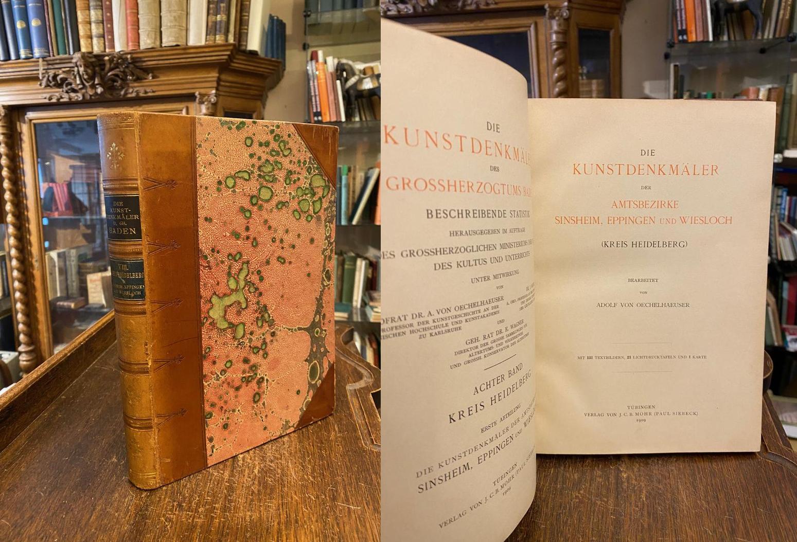 Heidelberg, Kreis. – Oechelhaeuser, Adolf von (Bearb): Die Kunstdenkmäler der Amtsbezirke Sinsheim, Eppingen und Wiesloch (Kreis Heidelberg). Tübingen, Verlag von J.C.B. Mohr (Paul Siebeck), 1909. 4° (26x18), II, 254 S., 1 Bl., mit 131 Abb. i Text und auf eingefalteten Tafeln, 21 Lichdrucktafeln auf stärkerem Papier und 1 ganzseitige grenzkolorierte Karte im Anhang, [so komplett], marmor OHldr mit 2 RSchildern, goldPrägung, marmorVorsätze, Exlibris und Namensstempel auf Innenspiegel, gutes sauberes Exemplar, [= Die Kunstdenkmäler des Großherzogtums Baden; 8 : herausgegeben im Auftrage des Grossherzoglichen Ministeriums der Justiz, des Kultus und Unterrichts unter Mitwirkung von A. von Oechelhaeuser, J. Sauer und E. Wagner],