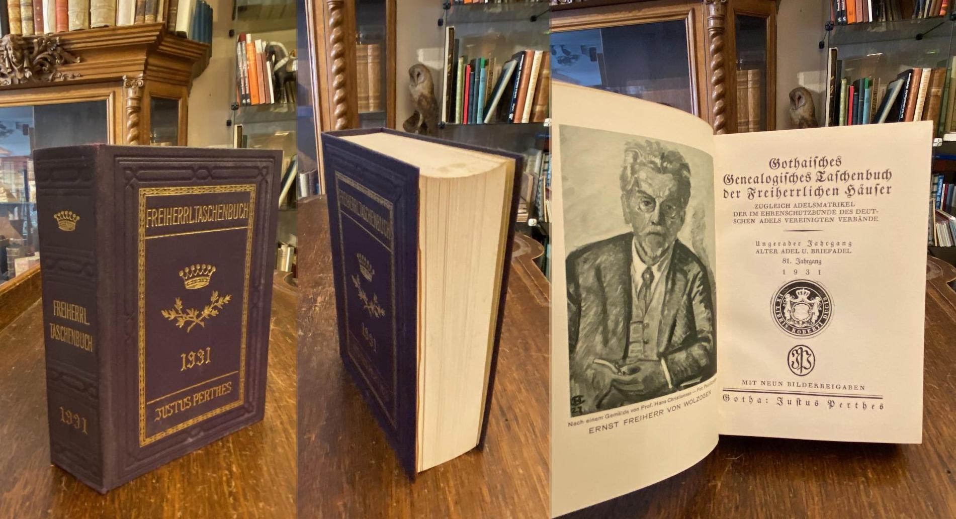 Gotha Freiherrliche Häuser 1931. – Gothaisches Genealogisches Taschenbuch der Freiherrlichen Häuser, zugleich Adelsmatrikel der im Ehrenschutzbunde des Deutschen Adels vereinigten Verbände 1931 : 81. Jahrgang : Ungerader Jahrgang: Alter Adel und Briefadel : Mit neun Bilderbeigaben : Gotha, Justus Perthes, (1930). 12° (15x10), XVI, 623, (1) S., mit Porträtfrontispiz, 3 weitere Porträttafel und 5 farbige Wappentafeln, (so komplett), violetter Oln mit goldPrägung, wohl ungenutzt, schönes gepflegtes Exemplar, [= Gotha Freiherrliche Häuser; Jg. 81 (1931)], [Fritsch; 569].– Einbandtitel ‚Freiherrl. Taschenbuch‘.–