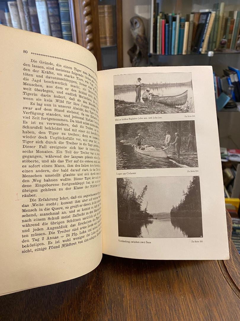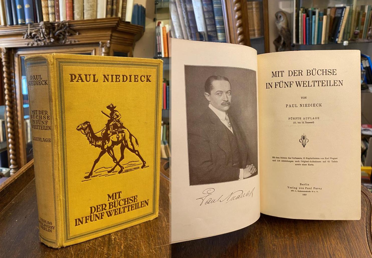 Niedieck, Paul: Mit der Büchse in fünf Weltteilen. 5. Aufl. (11.-13. Tsd.), Berlin, Verlag von Paul Parey, 1927. gr8° (24x16), (VII), 337 S., mit VerfasserPorträt, 15 Kapitelleisten von Karl Wagner und 116 Abb. nach Originalaufnahmen auf 62 Tafeln, sowie 1 gefaltete Karte, gelber Oln mit geprägtem Deckelbild und TitelPrägung, Ecken teils bestossen, der empfindliche Einband schwach angeschmutzt, Besitzvermerk auf Innenspiegel, sonst gutes sauberes Exemplar mit geringen Lesespuren,