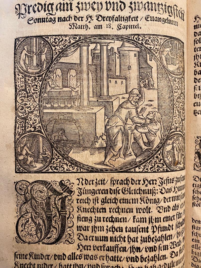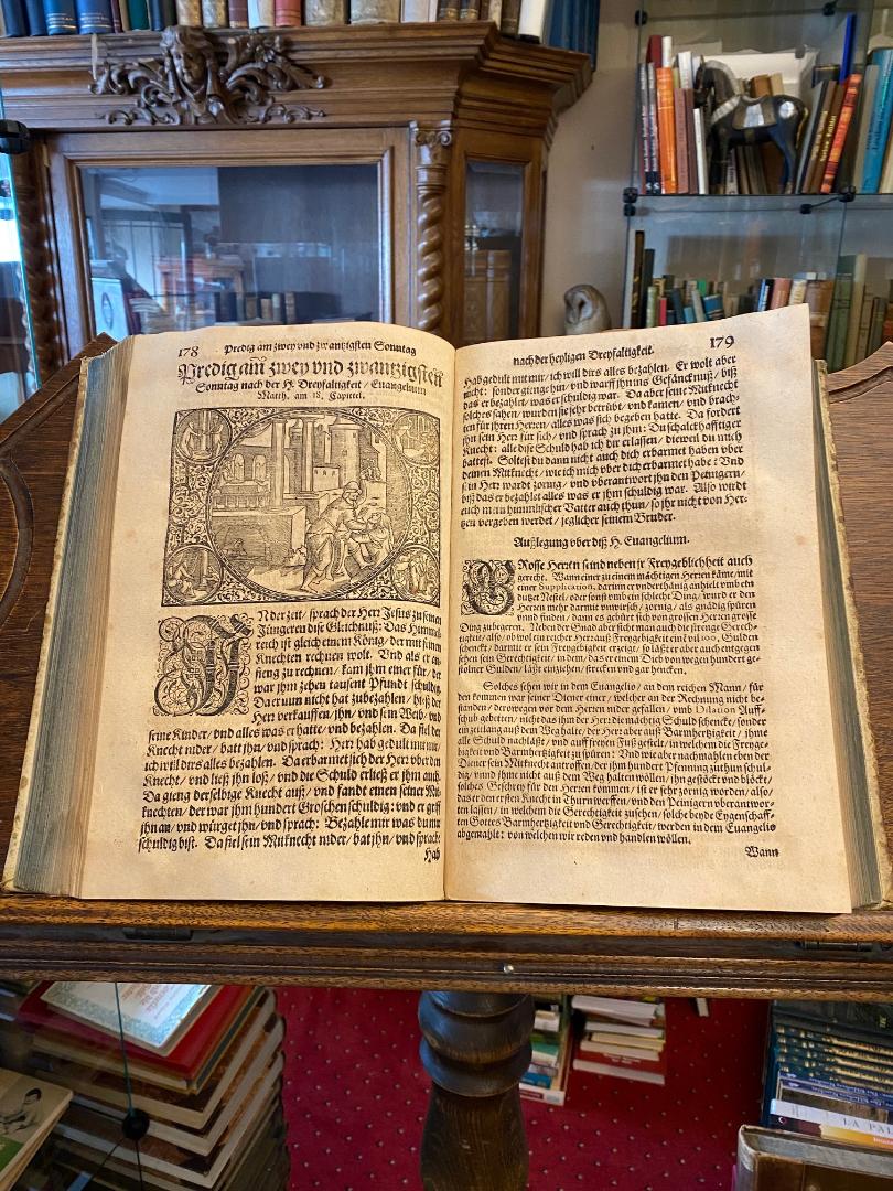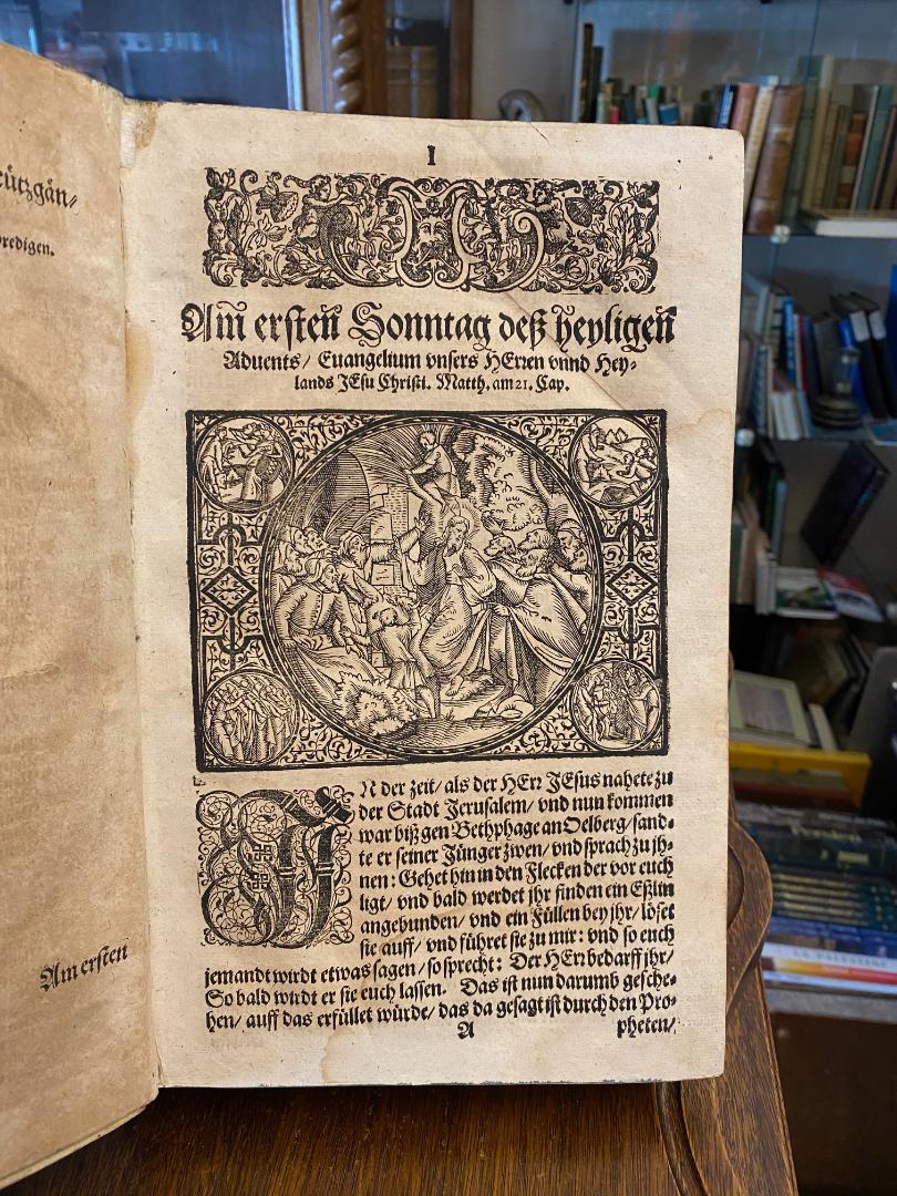 [Wagner, Bartholomäus (1560-1629)]: Postilla : Postill außerlesner Catholischer Predigen durch das gantze Jahr / in drey Theil abgesetzt : In dern erstem die Predigen auff alle Sontag, Im andernd die Predigen auff alle H. Festag. Im dritten mancherley Predigen auff etliche höchste Festag / und dann von der hochgebenedeyten Jungfrawen und Mutter Gottes Maria, von den Heligen Aposteln / von Creutzgängen / u. begriffen. Darinnen auch die Catolische Lehr / wider allerhand einreissende / Sectische Irrthumb / unnd Uncatholische / verführische Affter-Lehren / gründtlich und mit allem fleiß zu Fortpflantzung Göttlicher Ehr / und seines Heylreichen Worts defendiert wird. Durch ein Ehrwürdige Geistliche Person in Truck verfertiget. Freiburg, Gedruckt zu Freybureg im Breysigaw, allda zu finden bey Andres Buchstaben, 1619. 4° (30x20), 2 Bl., 223, 210, 342 S., mit 75 fast halbseitigen Holzstichen, sowie unzähligen Initialen und Vignetten, Pgmt d.Zt. mit handschriftl RTitel, angeschmutzt, die ersten 2 Bl. mit Feuchtigkeitsrand, Papier gebräunt, reich illustriertes schönes und festes Exemplar, auf Titel Besitzvermerk ‚Carmelus Rauensburgan‘ [wohl aus dem 1806 säkularisierten Karmeliter-Kloster Ravensburg].–
