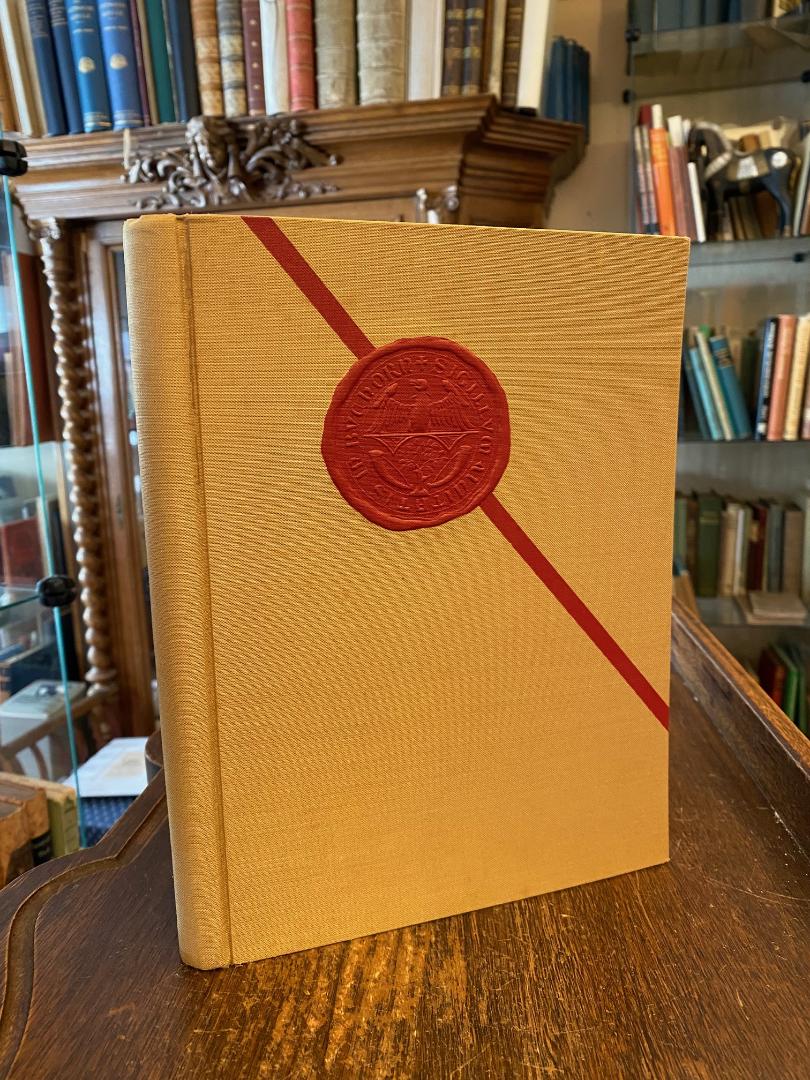 Friedrichshafen. – Hutter, Otto: Buchhorn – Friedrichshafen : Das Werden einer Stadt. Jubiläumsgabe der Gewerbebank Friedrichshafen. Friedrichshafen, Verlag Robert Gessler, (1939). 4° (26x19), 165 S. Textteil + 40 S. Tafelteil, Oln mit geprägtem Siegel, kaum gelesen, gutes gepflegtes Exemplar, persönliches Widmungsexemplar der Gewerbebank.–