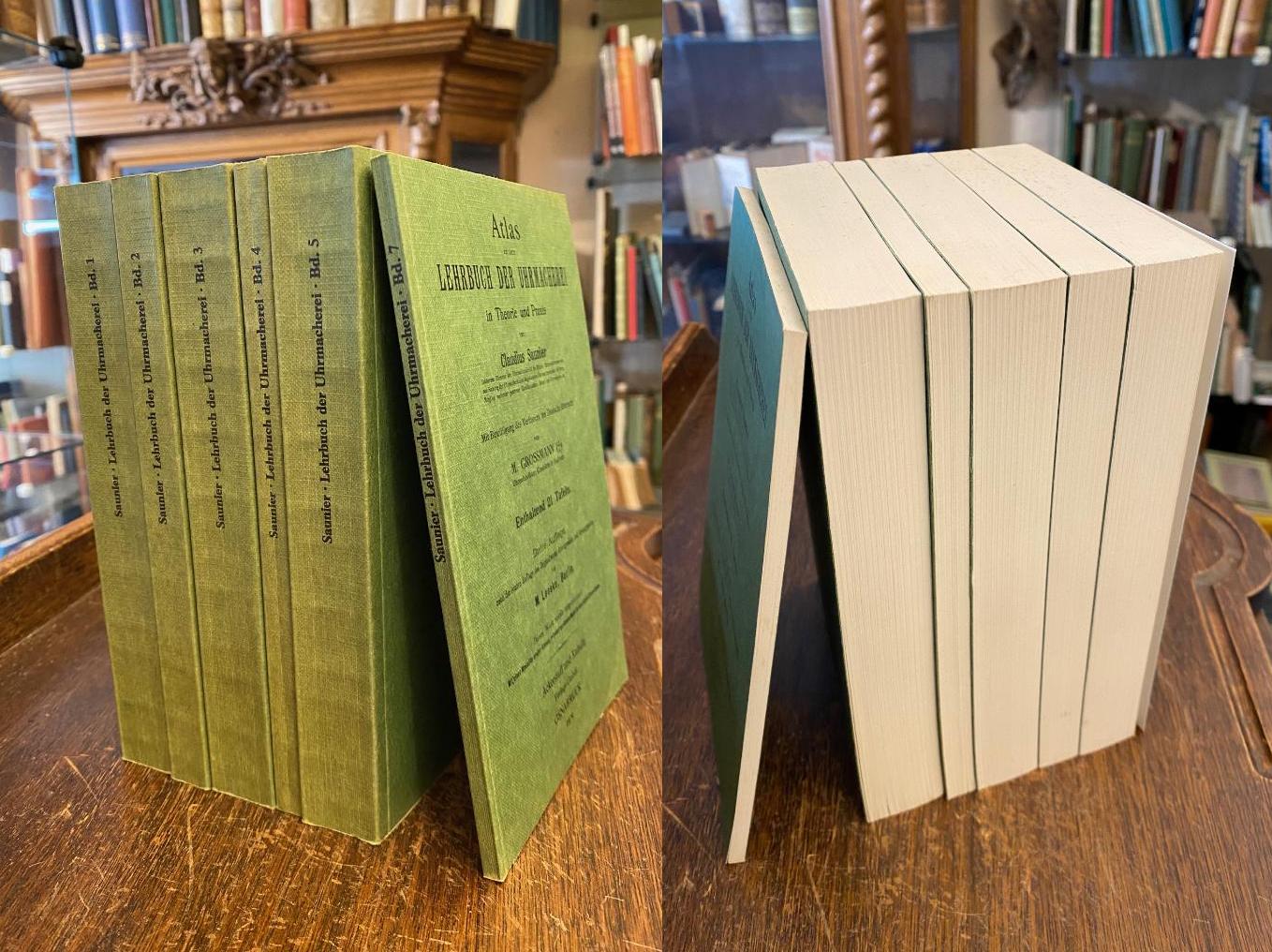 Saunier, Claudius: Lehrbuch der Uhrmacherei in Theorie und Praxis : Konvolut Band 1 – 5 + 7 (Atlas) : ohne Band 6. Mit Bewilligung des Verfassers ins Deutsche übersetzt von M. Grossmann, Uhrenfabrikant in Glashütte. Dritte Auflage, nach der letzten Auflage des Originalwerkes durchgesehen und herausgegeben von [Michael] Loeske. Ergänzungsbände von C. Dietzschold und Gustav Krumm. NACHDRUCK der dritten Auflage, Bautzen, Hübner’s Verlag, 1902-15. 6 Bände von 7, Osnabrück, Ackerstaff und Kuballe, 1979. 8° (19x13), XII,419; VIII,290; VIII,440; 187; XV,470; [fehlt: XXIX;365;(13)] S.; Atlas: 21 doppelseitige Tafeln, Gesamtwerk mit mehr als 600 Abb. und Tafeln, einheitliche grüne OKart (Brosch), Rücken etwas aufgehellt, Kopfschnitte angestaubt, kaum genutzt, fest und sauber, ohne Band 6 (Die elektrischen Uhren).–