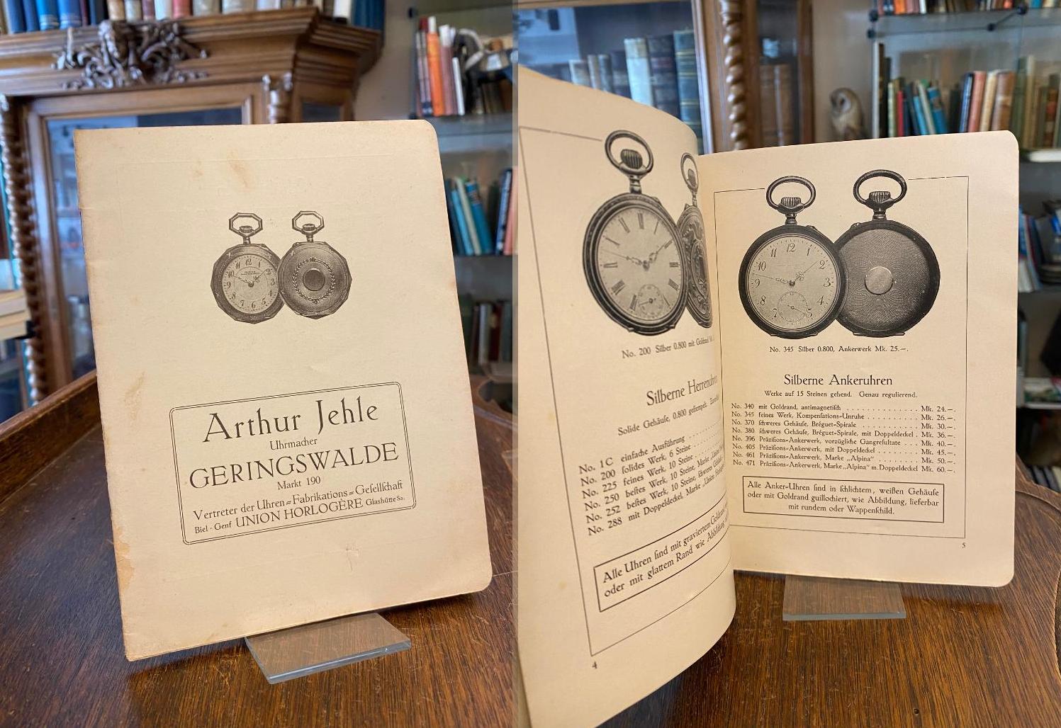 Jehle, Arthur : Uhrmacher Geringswalde (Hrsg): [Katalog] : Arthur Jehle Uhrmacher Geringswalde, Markt 190 : Vertreter der Uhren-Fabrikations-Gesellschaft Union Horlogere, Biel Genf Glashütte Sa. [enthält Schüleruhren, Taschenuhren (Silber, Tula, Goldplattiert, Gold), Chronographen, Sportuhren, Wecker, Küchenuhren, Regularoren, Standuhren, Goldwaren (Schmuck). Biel, Genf, Glashütte Sa., Verlag der Union Horlogere, [um 1920]. 8° (19x14), 32 S., reich illustriet, mit Preisangaben, OKart (Brosch), minimal angeschmutzt, fest und sauber,