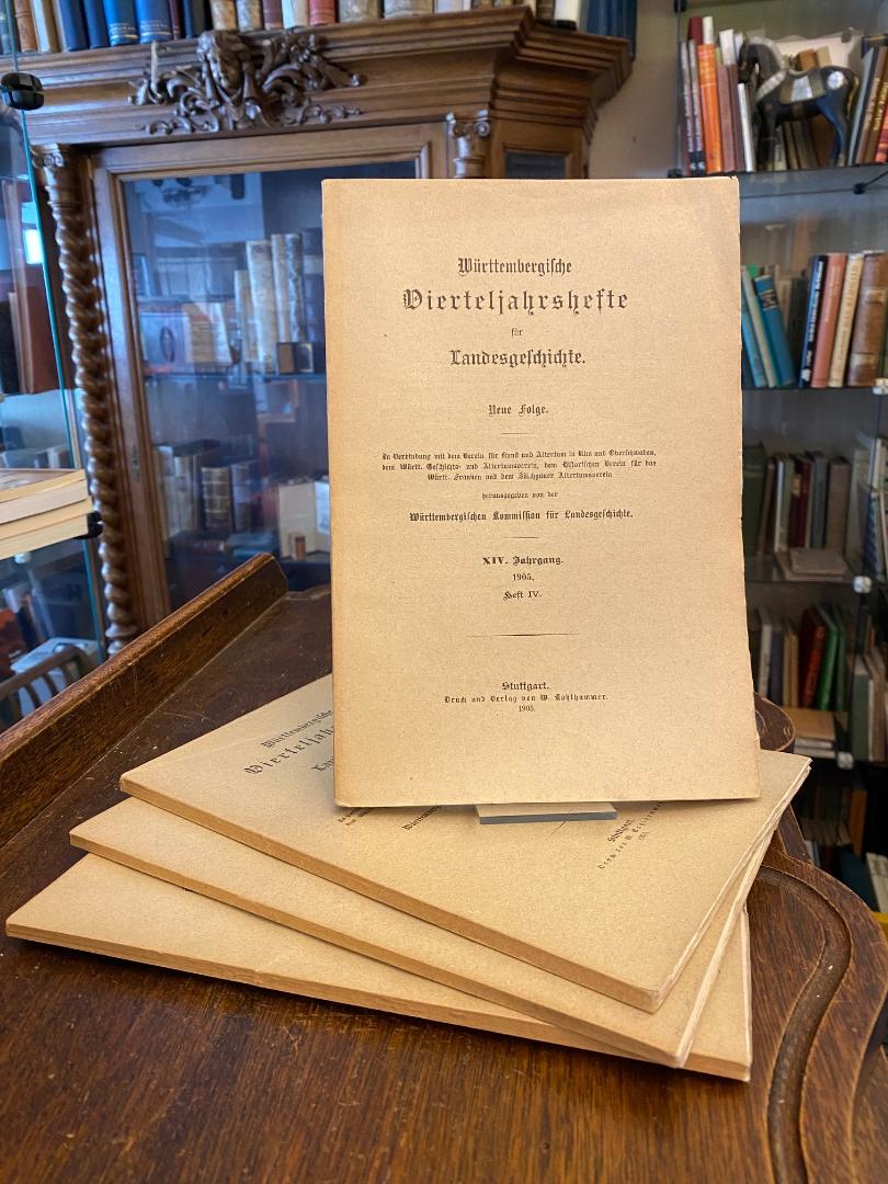 WVfLG NF 14 (1905). – Württembergische Kommission für Landesgeschichte (Hrsg): Württembergische Vierteljahreshefte für Landesgeschichte : Neue Folge XIV. Jahrgang 1905. 4 Hefte in 4 (so komplett), Stuttgart, Verlag von W. Kohlhammer, 1905. gr8° (24x16), 515, 37 S., OKart (Brosch), Unbeschnitten, offensichtlich ungelesen, [= Württembergische Vierteljahreshefte für Landesgeschichte; NF 14 (1905)], kompletter Jahrgang 1905 in vier Heften, durch Register erschlossen.–