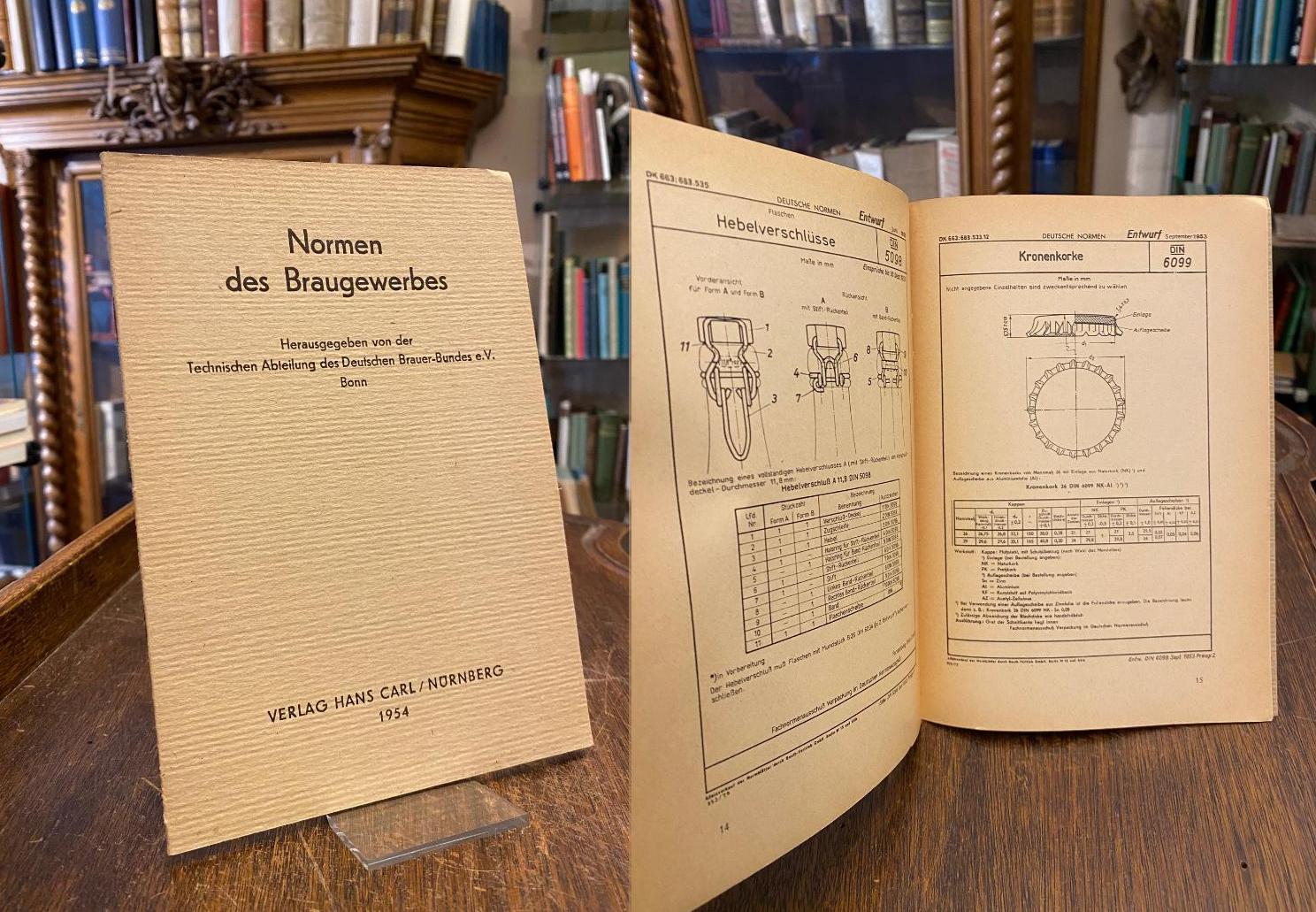 Normen des Braugewerbes. Herausgeben von der Technischen Abteilung des Deutschen Brauer-Bundes e. V. Bonn. Nürnberg, Verlag Hans Carl, 1954. 8° (21x15), 23 S., mit zahlr. graph. Darst., OKart (Brosch), sauber und wohlerhalten, Normierung von Bierflaschen, Bügelverschlüßen, Kronkorken, Beschläge für Holzkisten, u.a. nach DIN