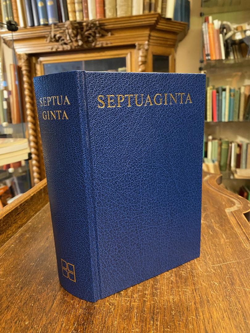 Bibel. – AT. – Rahlfs, Alfred (Hrsg): Septuaginta : Id est Vetus Testamwentum graece iuxta LXX interpretes edidit Alfred Rahlfs. Stuttgart, Deutsche Bibelgesellschaft, (1979). 8° (19x13), LXIX, 941 S. Dünndruckpapier, Faltbeilage, blauer OLdr mit goldTitel, Lesebändchen, ohne Gebrauchsspuren, wohl ungelesen, frisch, griechische verkleinerte Ausgabe in einem Band.–