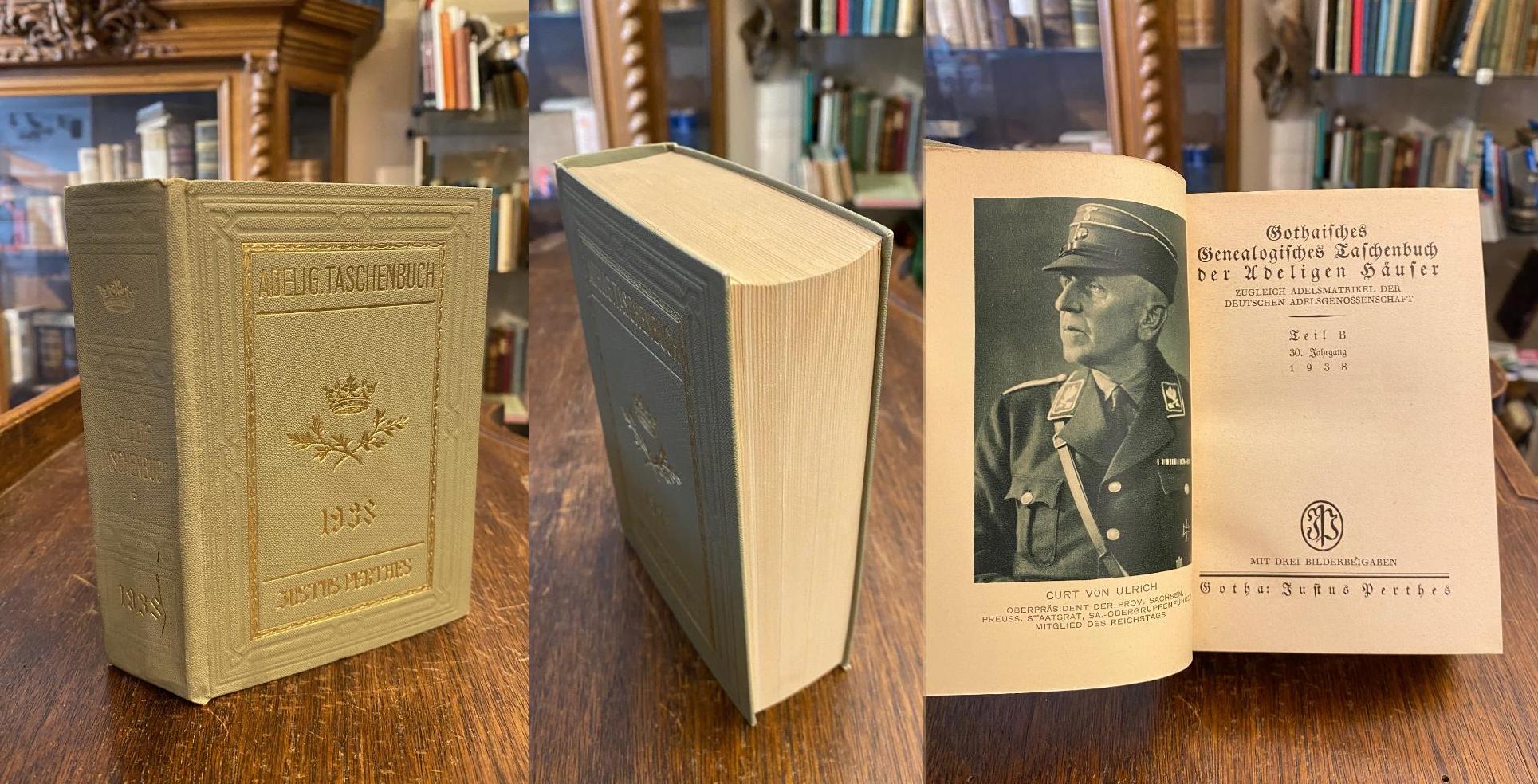 Gotha Briefadelige Häuser 1938. – Gothaisches Genealogisches Taschenbuch der Adeligen Häuser : Teil B : 1938 : 30. Jahrgang : Zugleich Adelsmatrikel der Deutschen Adelsgenossenschaft : Mit drei Bilderbeigaben. Gotha, Justus Perthes, (1937). 12° (15x10), XLIV, 638, (2) S., mit Porträtfrontispiz, 1 weiteren Porträttafel und 1 Wappentafel (so komplett), hellgrüner Oln mit goldPrägung, kaum genutzt, schönes gepflegtes Exemplar, [= Gotha Briefadelige Häuser; Jg. 30 (1938)], [Fritsch; 651].– Einbandtitel ‚Adelig. Taschenbuch : B‘.–