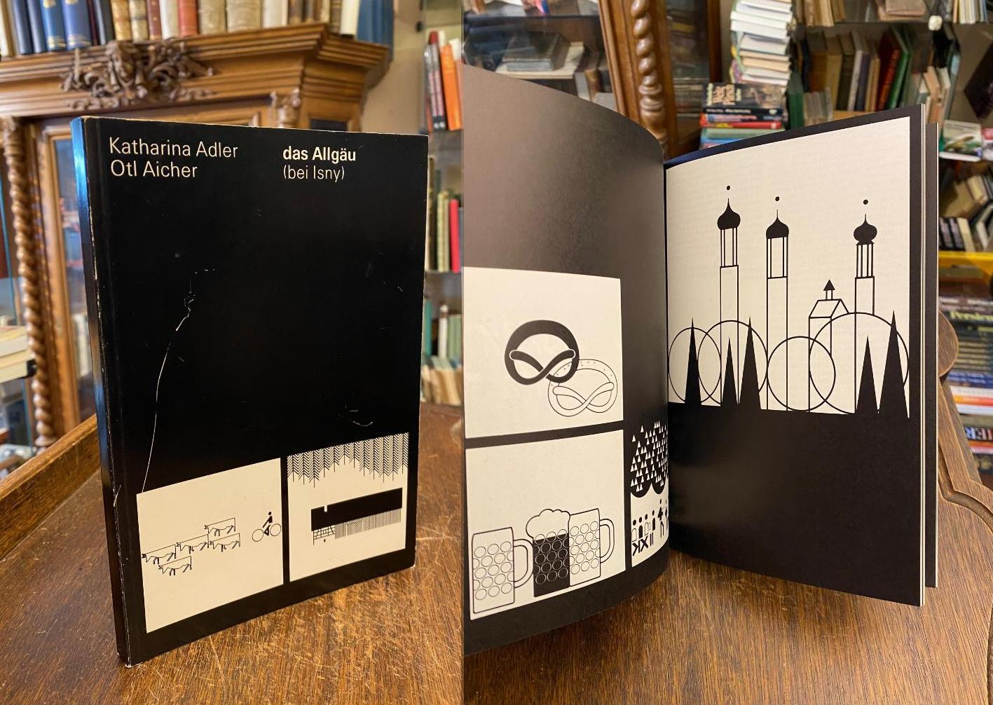 Adler, Katharina (Text) / Aicher, Otl (Zeichnungen) / Büro Aicher, Rotis (Gestaltung): Das Allgäu (bei Isny). (1. Aufl.), Isny, Stadt Isny/Allgäu / Vertrieb: Igel Laden : Ingrid Schwarz, (1981). 8° (22x16), 119 S., überwiegend illustriert mit 105 Bildern von Otl Aicher, mit 26 Texteinschüben von Katharina Adler, ill OKart (Brosch / Cromolux-Karton), Einband gering berieben und vorderseitig dünner oberflächlicher Kratzer, sonst sauber und gepflegt, Buchgestaltung und Typographie in typischer Otl Aicher Manier.–