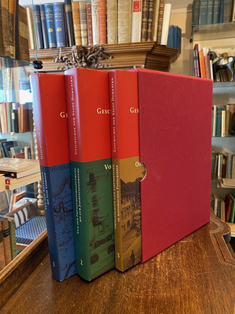 Dornbirn. – Matt, Werner / Platzgummer, Hanno (Hrsg): Geschichte der Stadt Dornbirn [in drei Bänden]: BAND I: Von den Anfängen bis zum Loskauf (Niederstätter, Alois / Tschaikner, Manfred).– BAND II: Von der Frühindustrialisierung bis zu Jahrtausendwende (Witernfelder, Hubert / Böhler, Ingrid / Matt, Werner).– BAND III: Ortsansichten und Lebenswelten in historischen Fotografien (Matt, Werner / Platzgummer, Hanno / Platzgummer, Helga). 3 Bände in 2 (so komplett), Dornbirn, Stadtarchiv und Stadtmuseum, (2002). 4° (30x22), 288; 407; 144 S., mit zahlr. Abb. und Faksimiles, Band 3 mit zahlr. historischen Ansichten, Oln mit OU im Leinenschuber, nahezu ungelesen, schöne gepflegte Exemplare,
