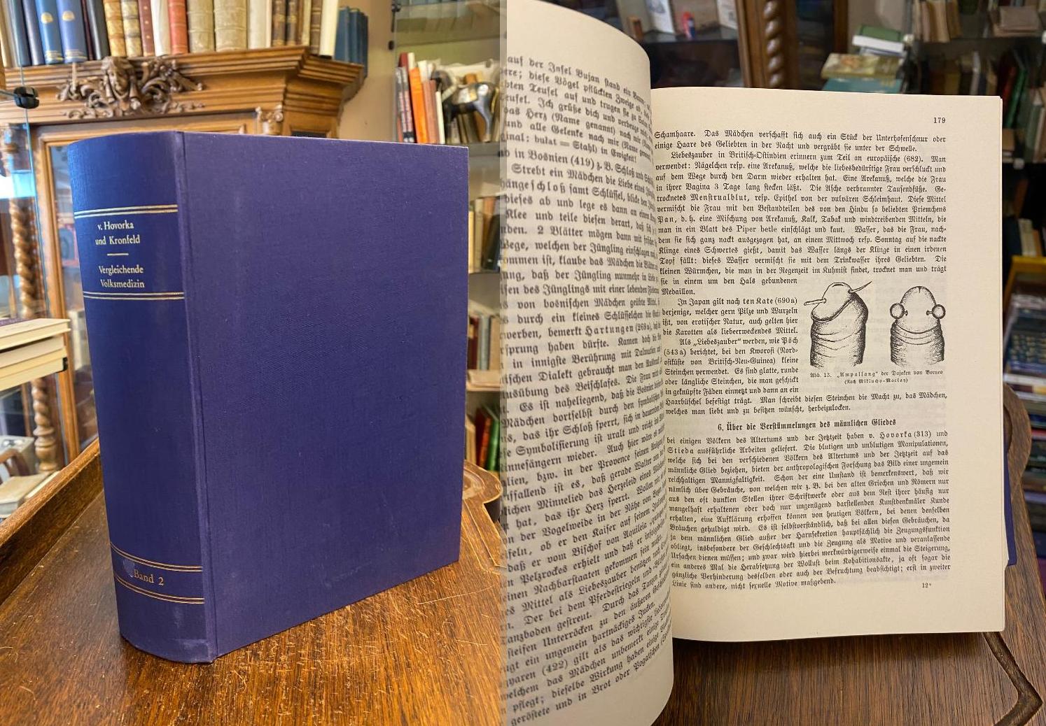 Hovorka, [Oscar] von / Kronfeld, [Alfred] (Hrsg): Vergleichende Volksmedizin : Eine Darstellung volksmedizinischer Sitten und Gebräuche, Anschauungen und Heilfaktoren, des Aberglaubens und der Zaubermedizin : BAND 2. [REPRINT] der Ausgabe Stuttgart, Verlag von Strecker und Schröder, 1909. nur Band 2 von 2, o. O., o. V., [um 1980]. 4° (26x18), IX, 960 S.,1 Bl., mit 138 TextAbb. und 15 Tafeln, blauer Oln mit goldRückentitel, Kopfschnitt etwas angestaubt, sauber und wohlerhalten, vorliegender zweiter Band behandelt Innere Medizin, Chirurgie, Geburtshilfe und Frauenkrankheiten, Kinderheilkunde, Hautkrankheiten, Augenkrankheiten, Ohrenkrankheiten, Zahnheilkunde und die Zaubermedizin.–