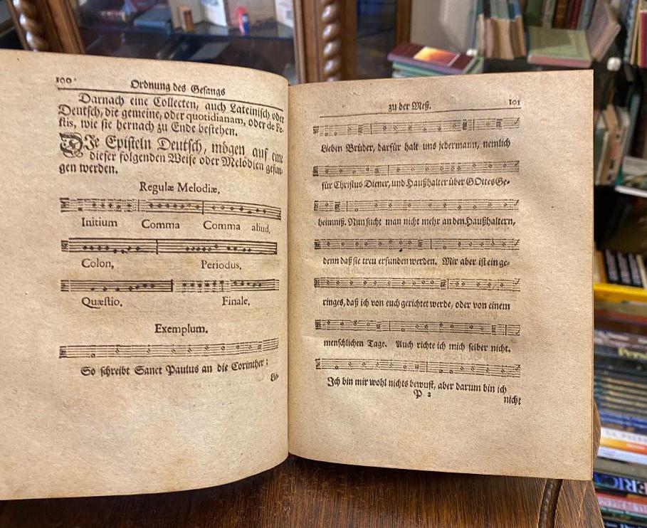 Agenda, Das ist: Kirchen-Ordnung, Wie sich die Pfarrherren und Seelsorger in ihren Aemtern und Diensten verhalten sollen. Für die Diener der Kirchen in Hertzog Heinrichs zu Sachsen, U.G.H. Fürstenthum gestelltet. Jetzo aufs neue aus Churfürst Augusti Kirchen-ordnung gebessert, auch mit vielen Collecten der Superintendenten, wie nicht weniger mit selbigen auf alle Wochen- Sonn- und Fest-Tage vermehret. [angebunden] Der kleine Katechismus, ohne und mit der Auslegung nebenst den Frag-Stücken und Haus-Tafel vor die Christliche Gemeine, gestellet durch D. Martin Luthern. Leipzig, Friedrich Lankisch, 1747. Leipzig, bey Friedrich Lanckischens Erben, 1748. 8° (21x17), 5 Bl., 258 S., 4 Bl.; 4 Bl., 56 S., (Katechismus) 6 Bl. (Kirchengebete), 40 S. (Eheordnung), mit mehreren Holzschnitt-Vignetten und mehreren Seiten Noten, roter Samteinband, dreiseitiger Goldschnitt, Kleisterpapier-Vorsätze, obKapital minimal verletzt, kaum genutzt, sauber und gepflegt, auf flVorsatz handschriftlicher Eintrag: ‚Diese Agenda habe ich beim Abbruch der alten Peterskirche [Leipzig] 1885 gerettet / wo die übrigen hingekommen sind ist mir nicht bekannt, denn es lag alles in Schutt und Trümmer, im Gebrauch bei den Gottesdiensten meiner Zeit ist sie nie gekommen. Alle die alten Bücher lagen über der Kanzel in einem finsteren Loch. A. Schmidt‘