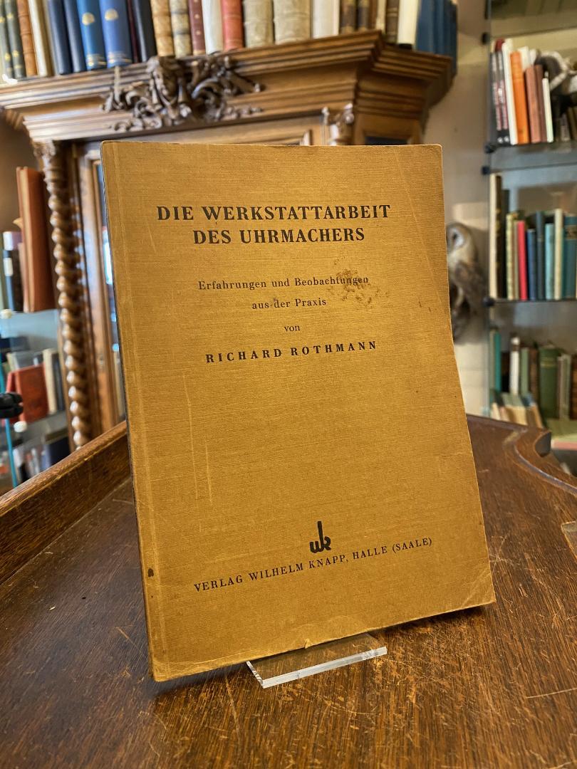 Rothmann, Richard: Die Werkstattarbeit des Uhrmachers : Erfahrungen und Beobachtungen aus der Praxis. Halle (Saale), Verlag Wilhelm Knapp, 1936. 8° (21x15), 80 S., OKart (Brosch), gering angeschmutzt, Uhrmacherstempel auf Titel, ordentliches Exemplar mit geringen Altersspuren, Richard Rothmann, Direktor der ALPINA Deutsche Uhrmacher-Genossenschaft.–