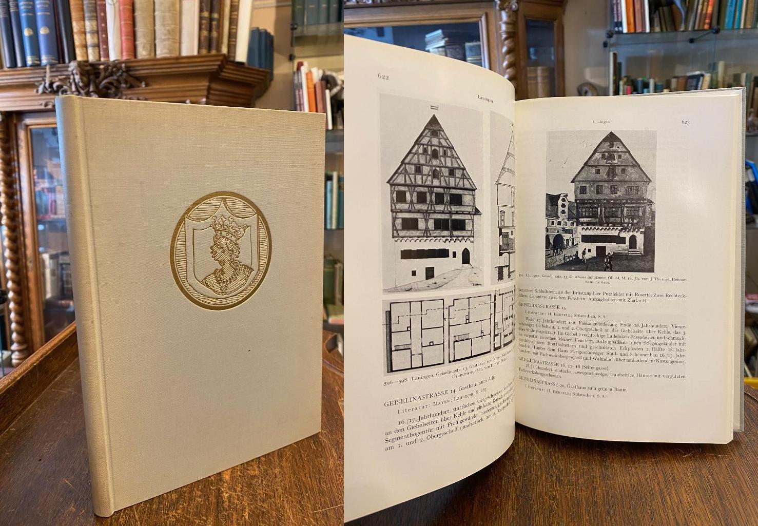 Lauingen an der Donau. – Meyer, Werner (Bearb): Die Kunstdenkmäler der Stadt Lauingen an der Donau. München, R. Oldenbourg Verlag, 1972. 4° (25x18), S. 497 – 681, mit 187 (Abb. 467 – 633), KartenVorsätze, Oln mit goldDeckelPrägung, gering angestaubt, Papier leicht gebräunt, sauber und wohlerhalten, [= SD aus Die Kunstdenkmäler von Bayern Regierungsbezirk Schwaben; 7 : herausgegeben vom Bayerischen Landesamt für Denkmalpflege, Landkreis Dillingen a der Donau bearbeitet von Werner Meyer],