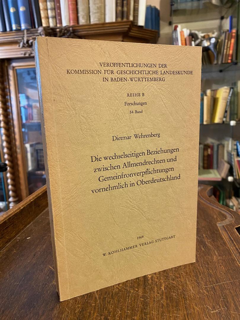 Wehrenberg, Dietmar: Die wechselseitigen Beziehungen zwischen Allmendrechten und Gemeinfronverpflichtungen vornehmlich in Oberdeutschland. Stuttgart, W. Kohlhammer Verlag, 1969. 8° (23x15), XXII, 242 S., 1 Bl., OKart (Brosch), etwas gebräunt, wohl ungelesen, schönes gepflegtes Exemplar, [= Veröffentlichungen der Kommission für Geschichtliche Landeskunde in Baden-Württemberg; Reihe B (Forschungen); 54],
