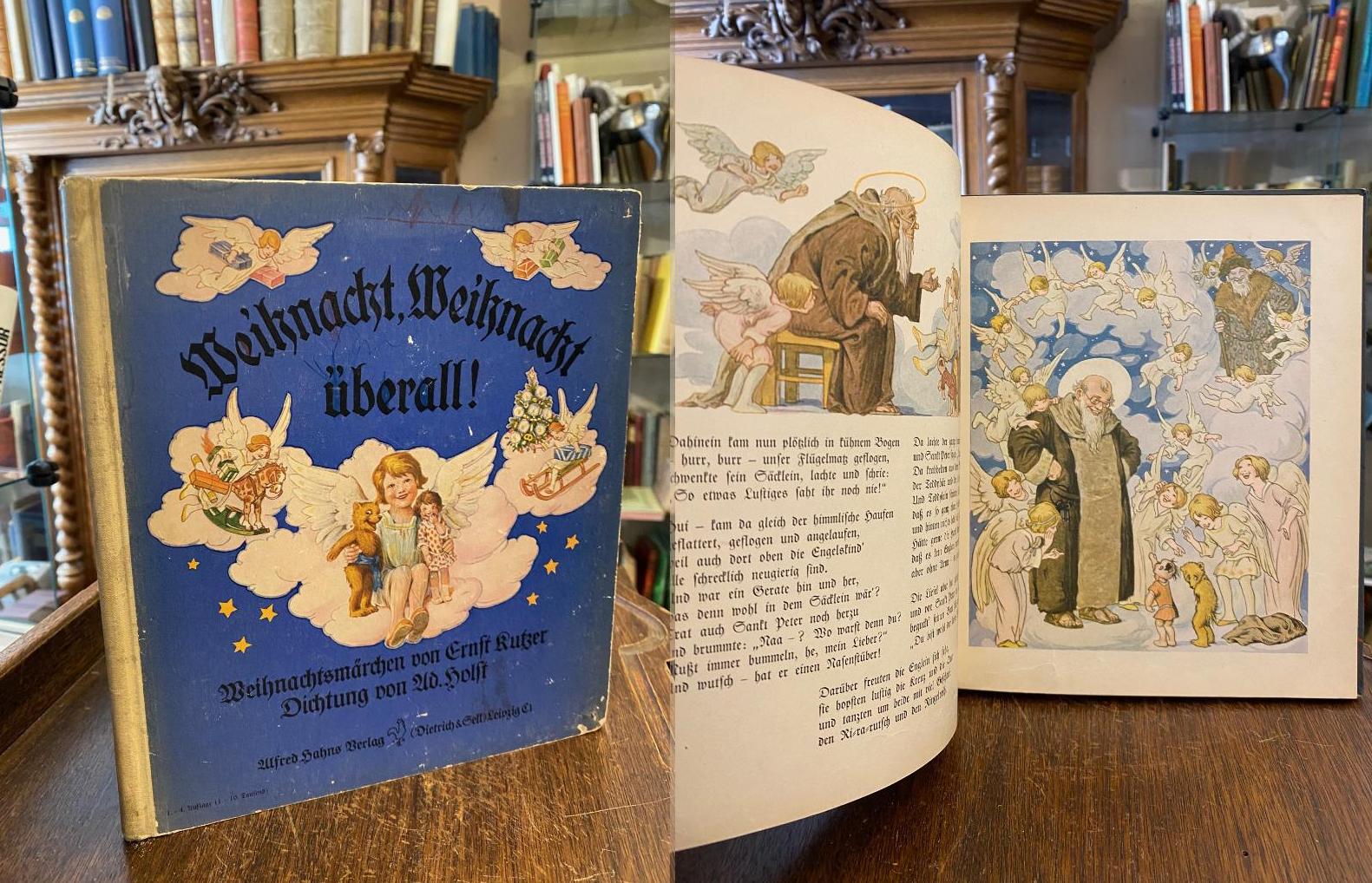 Kutzer, Ernst (Ill) / Holst, Adolf (Text): Weihnacht, Weihnacht überall! : Weihnachtsmärchen von Ernst Kutzer, Dichtung von Ad. Holst. 1.-4. Aufl. (1.-16. Tsd.), Leipzig, Alfred Hahn’s Verlag : (Dietrich & Sell), [1929]. gr8° (24x21), [32] S., zahlr. Illustrationen mit begleitenden Versen, ill OHln, gering angestaubt, Ecken und Kanten etwas bestossen, vereinzelt schwach fleckig und gelegentliches Einrisschen, 1 S. mit schwachem Kinderkritzel, ordentliches festes Exemplar mit mässigen Altersspuren,