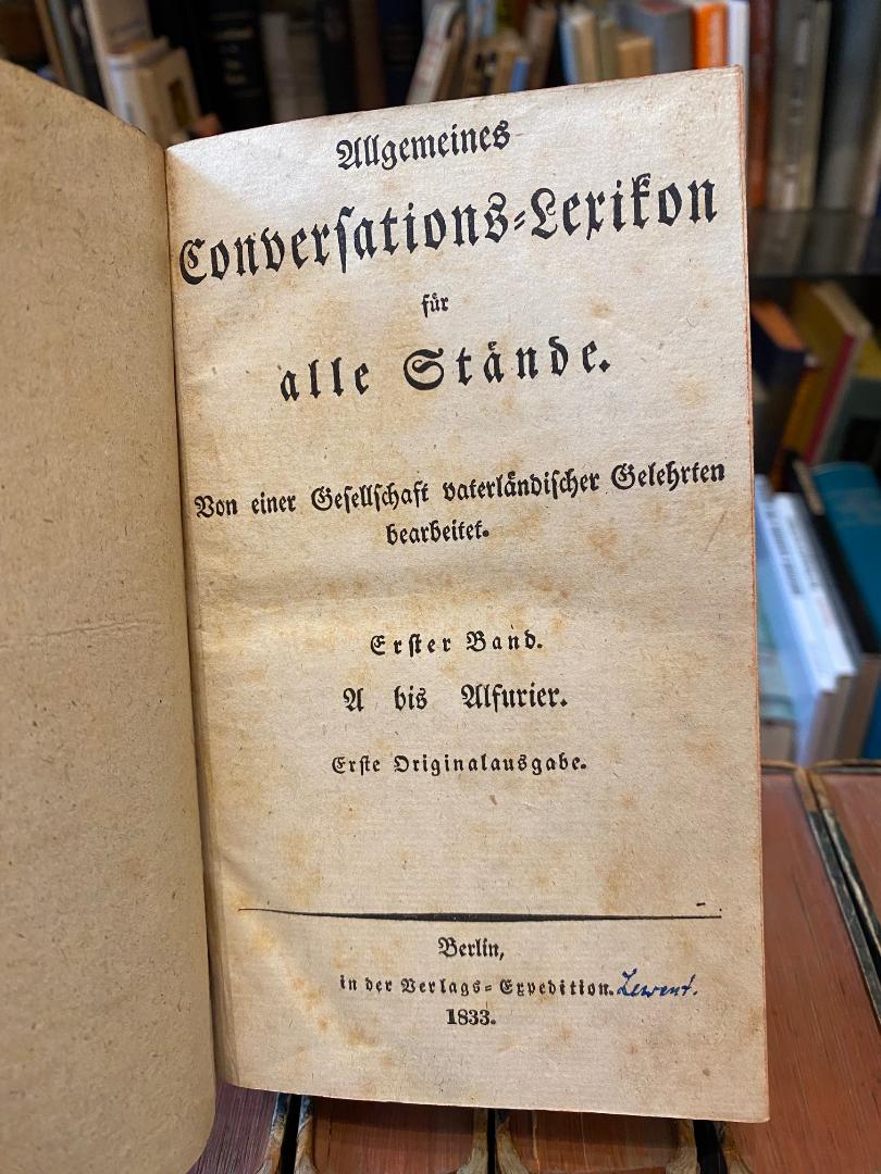 Allgemeines Conversations-Lexikon für alle Stände : Von einer Gesellschaft vaterländischer Gelehrten bearbeitet [in achzehn Bänden]. 18 Bände in 18, Berlin, in der Verlags-Expedition / ab Bd 2: Lewents Verlags-Buchhandlung, 1833 – [1841]. 8° (18x11), XVI,558; XXVI,772; 754,XVIII; 590,XX; 778;XXIV; 626,XII; 711,XIV; 635,XV; 460,IX; 430,XII; 693,XV; 661,XVI; 1150,XX; 798,XVI; 1043,XVI; 840,XVI; 1140,XXI; 432 S.,95 wBl.; einheitl marmor Hldrbde d.Zt. mit rotem RückenSchild, goldRückenPrägung, dreiseitiger Rotschnitt, Name auf Vorsatz, Leder etwas berieben, etwas bestossen, gute gepflegte Exemplare, fest und sauber, auf dem Titel teils die Angabe Erste bzw Zweite Originalausgabe.– jeder Band enthält ein Register der enthaltenen Artikel, Ausnahme der letzte Band 18 ohne separates Titelblatt und ohne Register, endet im Artikel Zwingli mitten im Satz und dann 95 leere Blatt stärkeres Papier angebunden.–
