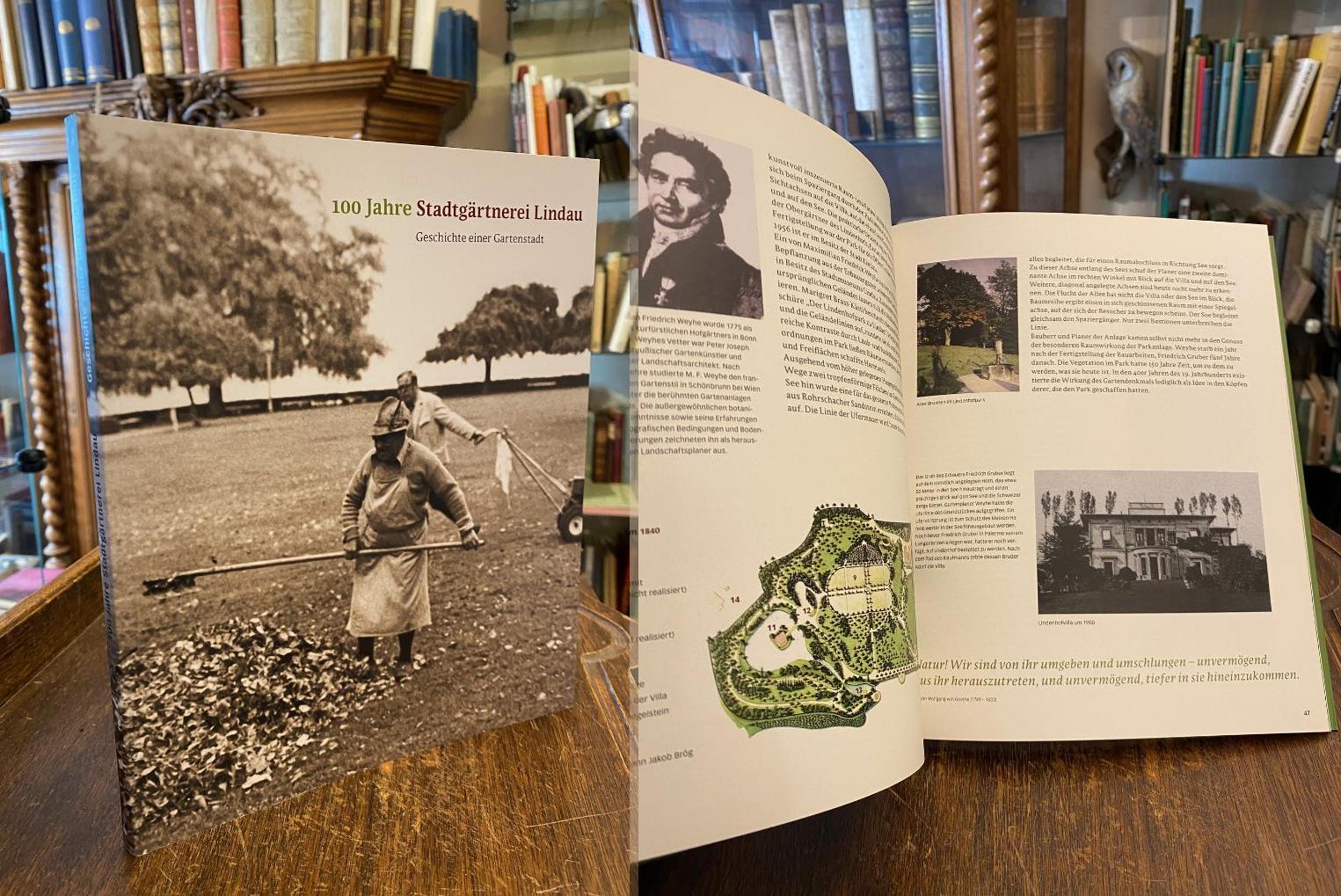 Lindau. – Weininger, Maria (Text/Red): 100 Jahre Stadtgärtnerei Lindau : Geschichte einer Gartenstadt. Lindau, Stadtgärtnerei (Hrsg) / Lindauer Druckerei Eschbaumer (Druck), 2009. 4° (25x21), 96 S., mit zahlr. teils historischen Abb., fotoill OKart (KlappenBrosch), ohne Gebrauchsspuren, wohl ungelesen, enthält: Natur und Mensch.– Geschichte der Gartenstadt Lindau.– Parkanlagen der Stadt (Oskar-Groll-Anlage und Stadtgarten.– Uferweg.–