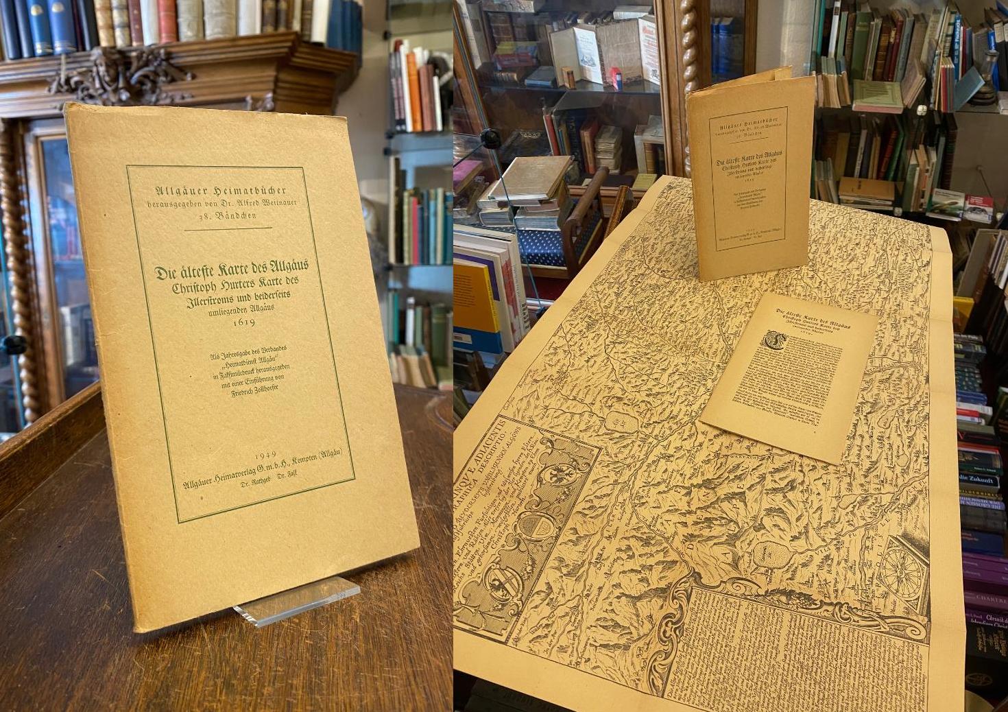 Hurter, Christoph (Ill) / Zollhoefer, Friedrich (Text): Die älteste Karte des Allgäus : Christoph Hurters Karte des Illerstroms und beiderseits umliegenden Allgäus 1619. Als Jahresgabe des Verbandes Heimatdienst Allgäu in Faksimiledruck herausgegeben mit einer Einführung von Friedrich Zollhoefer. Kempten, Allgäuer Heimatverlag, 1949. 8° (22x15), Karte 44 x 96 cm + 12 seitige Textbeilage, Faltmappe mit Titeldruck, sauber und wohlerhalten, [= Allgäuer Heimatbücher; 38 : herausgegeben von Alfred Weitnauer],
