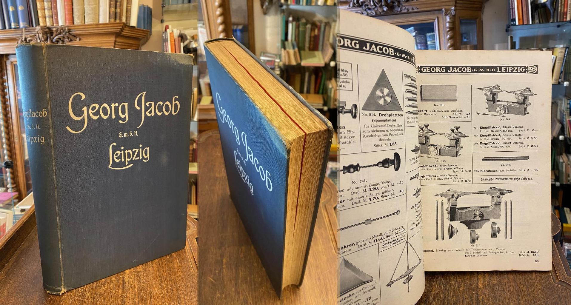 Jacob, Georg, Leipzig (Hrsg): [KATALOG] : Werkzeuge und Maschinen für Uhrmacher und Goldarbeiter : Furnituren, Uhrenketten, Ringe usw., Schaufenster-Ausstattungsstücke von Georg Jacob, Leipzig, eingetragenes Warenzeichen ‚UBA‘. Leipzig, Georg Jacob, 1911. 4° (32x22), (XX), 848 S., reich illustriert mit Artitel mit Preisangaben, sowie Ansichten aus den Kommissionierungslagern, Oln mit TitelPrägung, Ecken minimal bestossen, kleiner Fleck an der oberen Ecke, insgesamt etwas angestaubt, gutes Exemplar, fest und sauber,