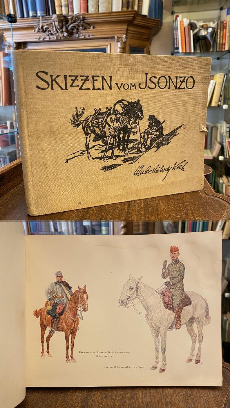 Koch, Ludwig (1866-1934) (Ill): Skizzen vom Isonzo : 124 Darstellungen von Maler Ludwig Koch. Wien, Verlag von L. W. Seidel & Sohn, [1916]. 4°quer (20x25), [56] Bl., mit 1 Handschrift-Faksimile und 53 (davon 8 farb) Tafeln, ill Oln, Einband angeschmutzt / etwas staubrandig, Schließbänder abgerissen, Papier mit Feuchigkeitsrand, fest und sauber,