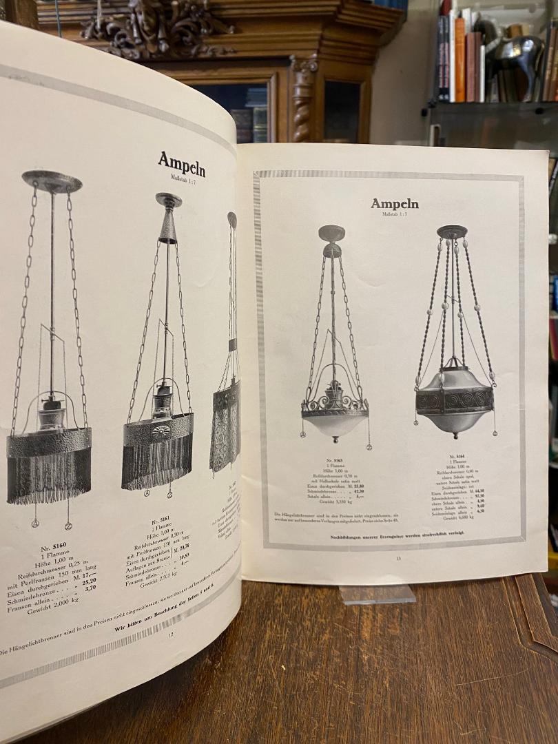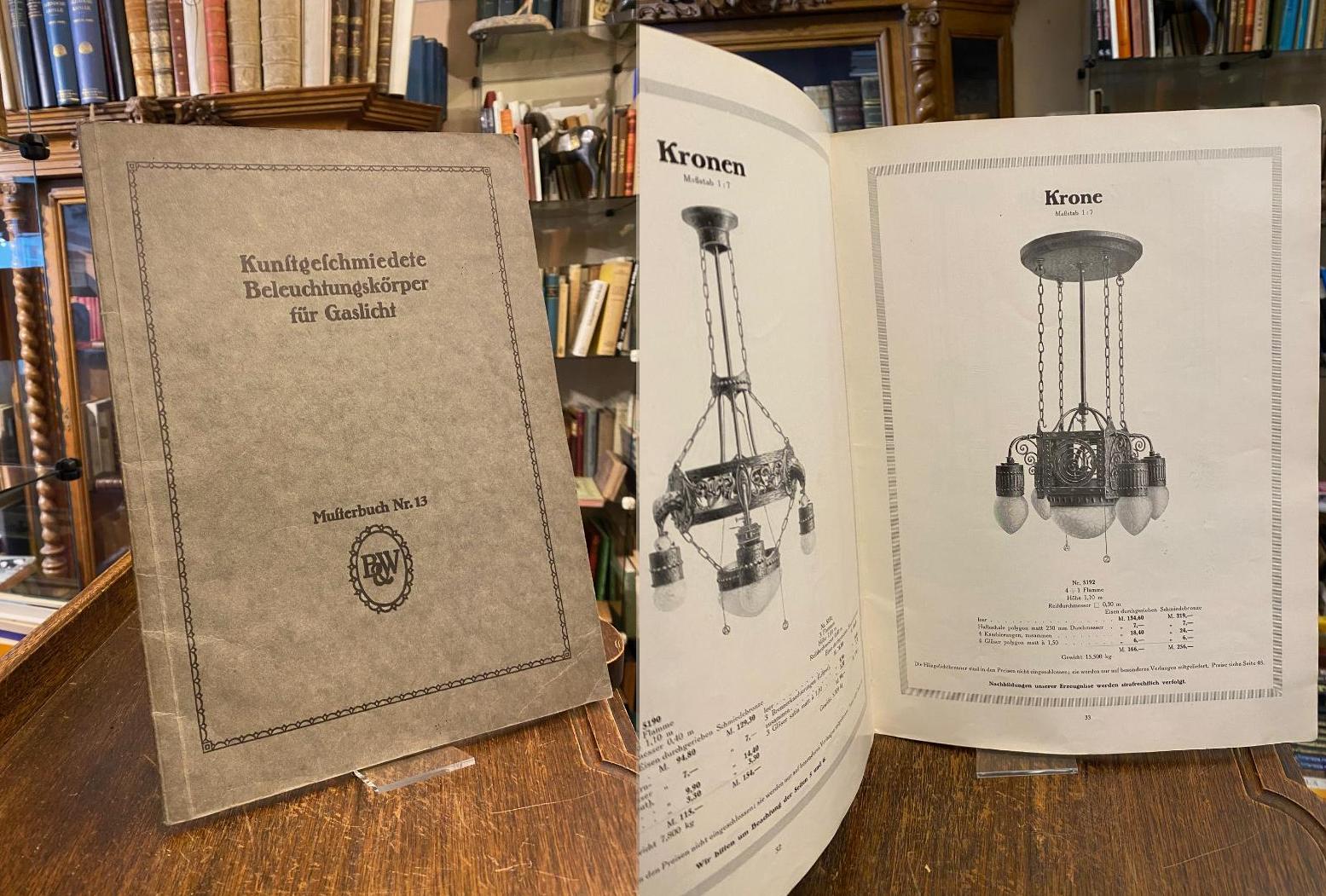 Bergner & Weiser : Pössneck-Köstitz (Hrsg): B & W : [Katalog] Kunstgeschmiedete Beleuchtungskörper für Gaslicht : Musterbuch Nr. 13 : (Katalognummern 5001-5269). [Pössneck-Köstitz], Bergner & Weiser, [um 1910]. 4° (32x24), 48 S., mit teils ganzseitigen Abb. meist von Deckenlampen (Pendel, Ampel, Krone) sowie Wandarme und Tischlampen, jeweils mit Preisangaben, OKart (Brosch) mit Titeldruck, kaum gelesen, sauber und wohlerhalten, ‚Mit erscheinen dieses Musterbuchs verlieren der Katalog Nr. 6 nebst Nachtrag … ihre Gültigkeit.‘