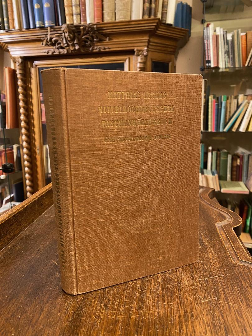 Lexer, Matthias von: Lexers Mittelhochdeutsches Taschenwörterbuch. 28. Aufl., Stuttgart, S. Hirzel Verlag, 1956, 8° (21x14), VIII, 343 S., brauner Oln gewachst mit goldTitel, Name auf Vorsatz, Vorsatz mit braunen Tesa-Schatten, sonst fest sauber und gepflegt,