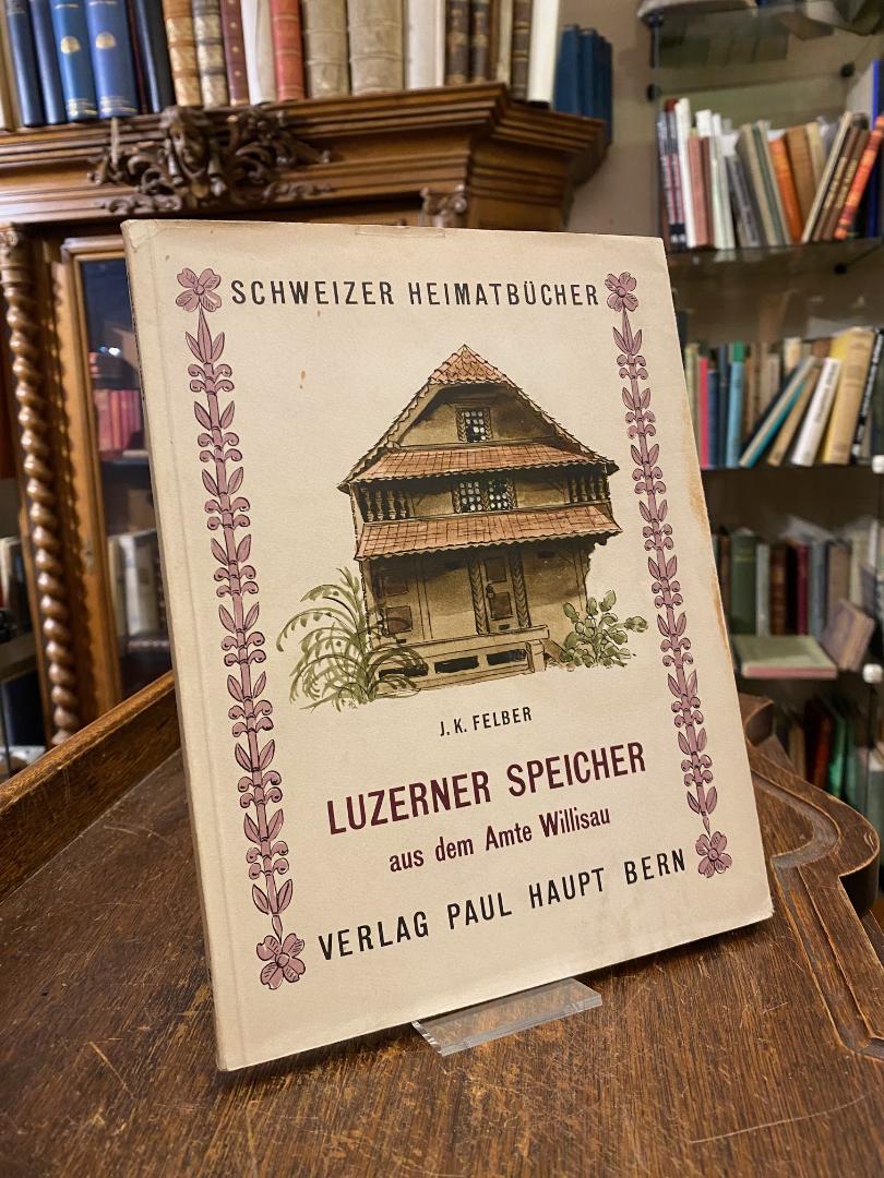 Felber Johann Kandid: Luzerner Speicher aus dem Amte Willisau. Bern, Verlag Paul Haupt, (1951). gr8° (24x18), 56 S., mit 5 TextAbb. und 32 ganzseitige fotograf Aufnahmen mit Beschreibung, ill OKart (englOBrosch), Umschlag an der Kante etwas gebräunt, Exlibirs auf Innenspiegel, fest und sauber, [= Schweizer Heimatbücher; 40 : Innerschweizer Reihe; 4 : herausgegeben von Walter Laedrach],