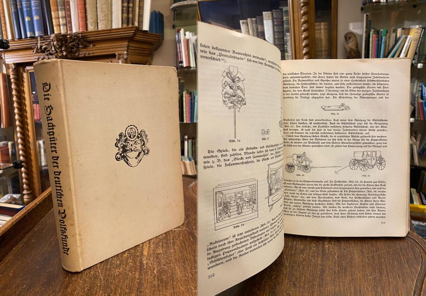 Erich, Oswald A. (Hrsg): Die Sachgüter der deutschen Volkskunde. Mit Beiträgen von Friedrich Baumhauer, Karl Berling, Walther Bernt, Otto Bramm, Wolfgang Bruhn, Astrid Dibbelt, Oswald A. Erich, Viktor von Geramb, Arthur Haberlandt, Fritz Hellwag, Waldemar Heym, Konrad Hüseler, Dorothee Klein, Heinz Knorr, Rudolf Kriß, Franz Krüger, Otto Lehmann, Fritz Rumpf, Hert Schlenger, Carl Schuchhardt und Karl von Spieß. Berlin, Verlagsbuchhandlung Herbert Stubenrauch, 1934. 4° (25x19), IX, 416, 66 S., mit 610 Abb. im Text und auf 66 Kunstdrucktafeln im Anhang, sowie 1 Karte, heller Oln mit Deckel- und RückenPrägung, etwas angestaubt, vereinzelte Stockflecken, fest und sauber, [= Jahrbuch für historische Volkskunde; III.IV. Band : begründet von Wilhelm Fraenger, fortgeführt von Walter Krieg], I. Holz und Haus.– II. Gebrauchs- und Baukeramik.– III. Textilien und Tracht.– IV. Eisen und andere Metalle.– V. Verschiedenes.–
