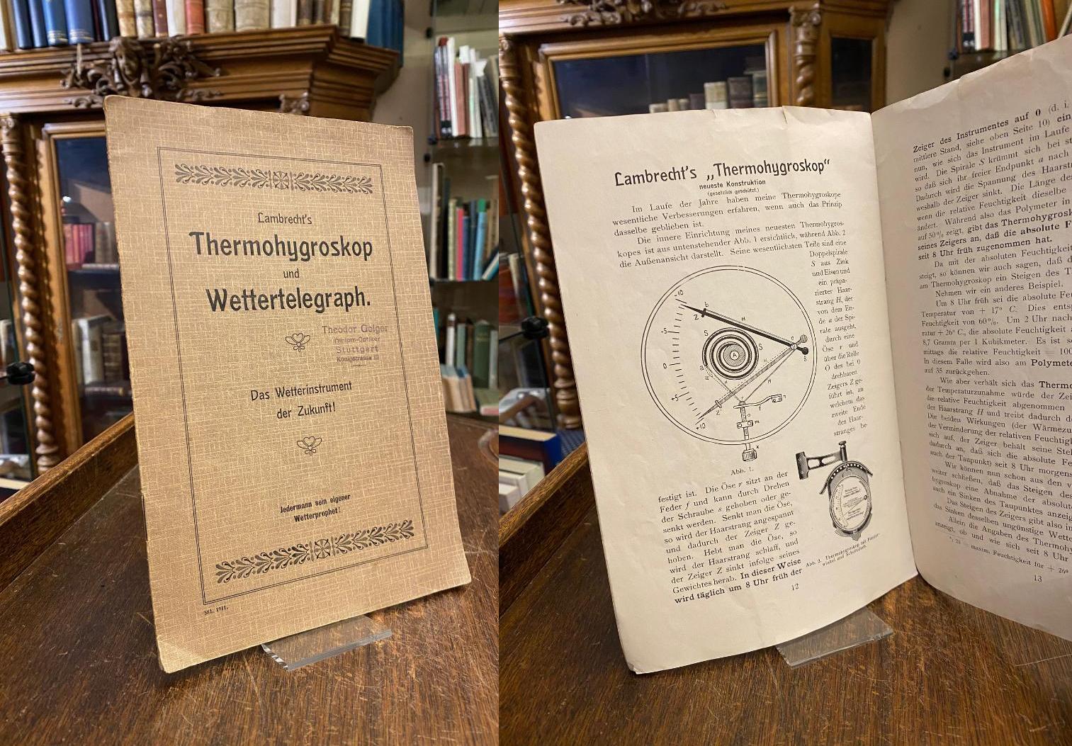 Lambrecht, Wilhelm Lambrecht’s Thermohygroskop und Wettertelegraph : Das Wetterinstrument der Zukunft. 4., verbesserte Aufl., [Göttingen], [Wilhelm Lambrecht], (1911). gr8° (24x16), 16 S., mit 3 Abb., OKart (Brosch), geringe Randläsuren, Händlerstempel auf Umschlag/Titel, sauber,