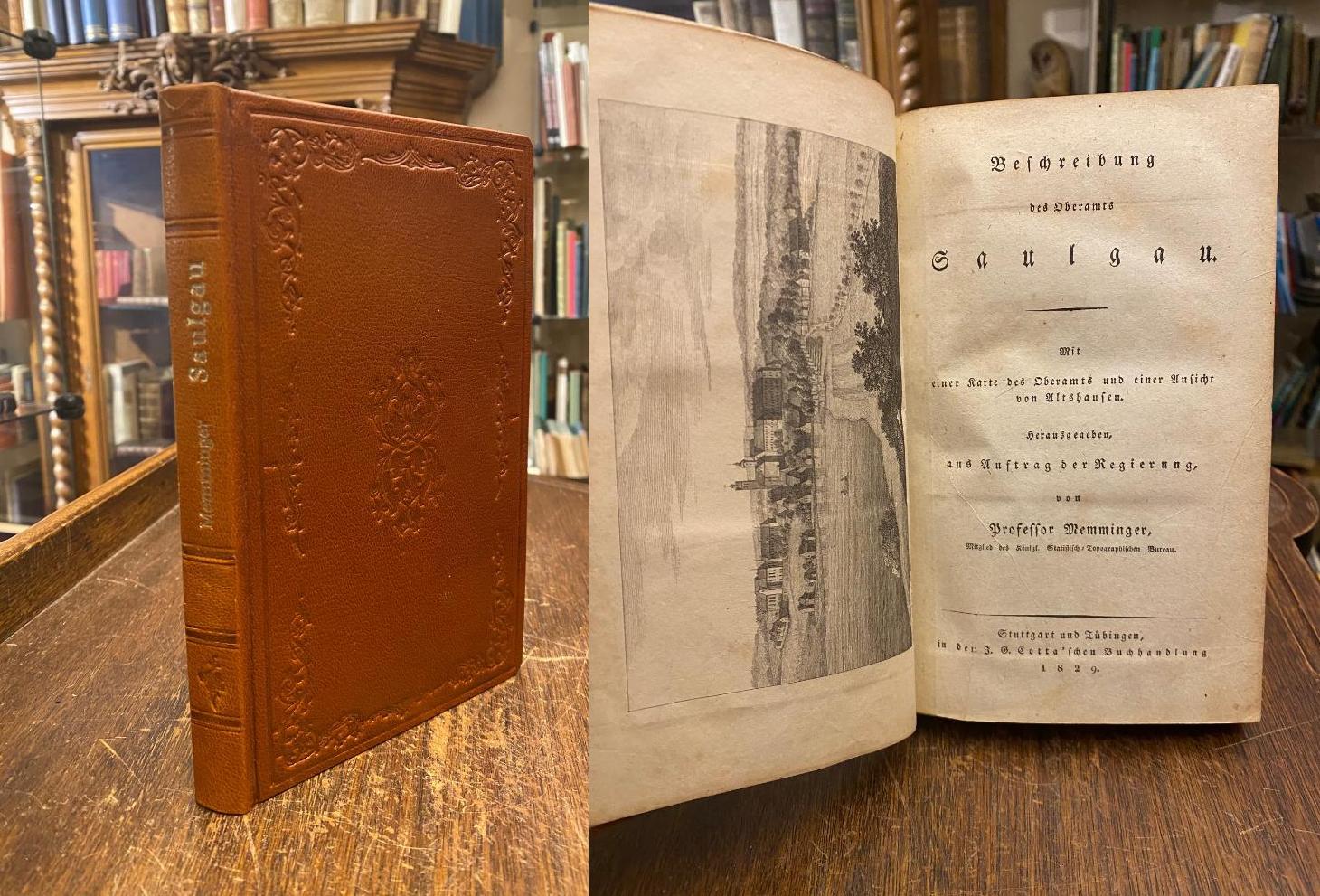 Saulgau, Oberamt. – Memminger, [Johann Daniel Georg von]: Beschreibung des Oberamts Saulgau. Mit einer Karte des Oberamts und einer Ansicht von Altshausen, [sowie vier Tabellen]. Stuttgart und Tübingen, Verlag der Cotta’schen Buchhandlung, 1829. 8° (20x13), 240 S., mit llith Frontispiz (Altshausen von Wölfle nach Sauter), sowie 4 Tabellen auf 2 mehrfach gefalteten Tafeln, neuer brauer Ldr mit beidseitig dekorativer BlindPrägung und goldRückentitel, die letzten 2 Blatt mit kleinem Fleck im oberen Rand, es fehlt die Karte, sonst schön, ohne die Karte.–