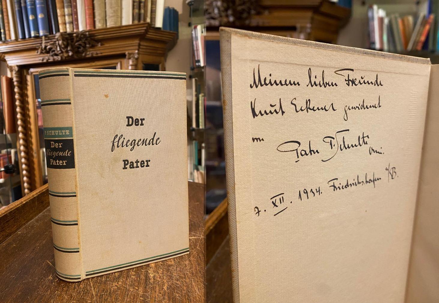 Schulte, Paul (OMI Oblatenpater : Gründer und Leiter der MIVA Missions-Verkehrs-Arbeitsgemeinschaft e.V.): Der fliegende Pater : Das Werk eines modernen Missionars. (1. Aufl.), Berlin, Im Verlag Ullstein, (1934). 8° )20x12), 265 S., mit 17 Abb. (Verfasserporträt und fotograf Aufnahmen), Oln mit TitelPrägung ohne OU, Schnitt angestaubt/gebräunt, sonst fest und sauber, auf Innenspiegel handschriftliche SIGNIERT Widmung des Autors für den Zeppelin-Kontrukteur Knut Eckener, Sohn von Hugo Eckener: ‚Meinem lieben Freunde / Knut Eckener gewidmet / von Pater P. Schulte OMI / 7.XII.1934 Friedrichshafen a/B.‘