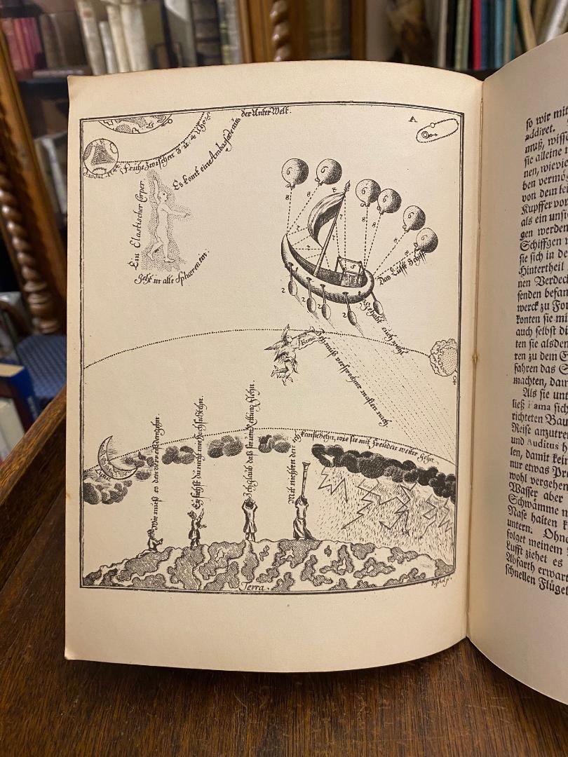 Kindermann, Eberhard Christian: Die Geschwinde Reise auff dem Lufft-Schiff 1744 : Siebzehnter Erasmusdruck 1923 : Nr. 15 von 239 Exemplaren. [Berlin], [Elias Erasmus], 1923. 8° (22x17), 30 S., mit 1 Tafel, OHartBrosch mit Buntpapierbezug und Titelschild, etwas berieben und angestaubt, gutes Exemplar, NACHDRUCK der Ausgabe ‚Die Geschwinde Reise auf dem Lufft-Schiff nach der obern Welt, Welche jünsthin fünff Personen angestellet, um zu erfahren, ob es eine Wahrheit sey, daß der Planet Mars den 10. Jul. dieses Jahrs das erste mahl, so lange die Welt stehet, mit einem Trabanten oder Mond erschienen? : Der untern Welt zu curieuser Gemüths-Ergötzhng und Versicherung dieser Begebenheit mitgetheilet durch die allgemeine Fama‘, 1744.