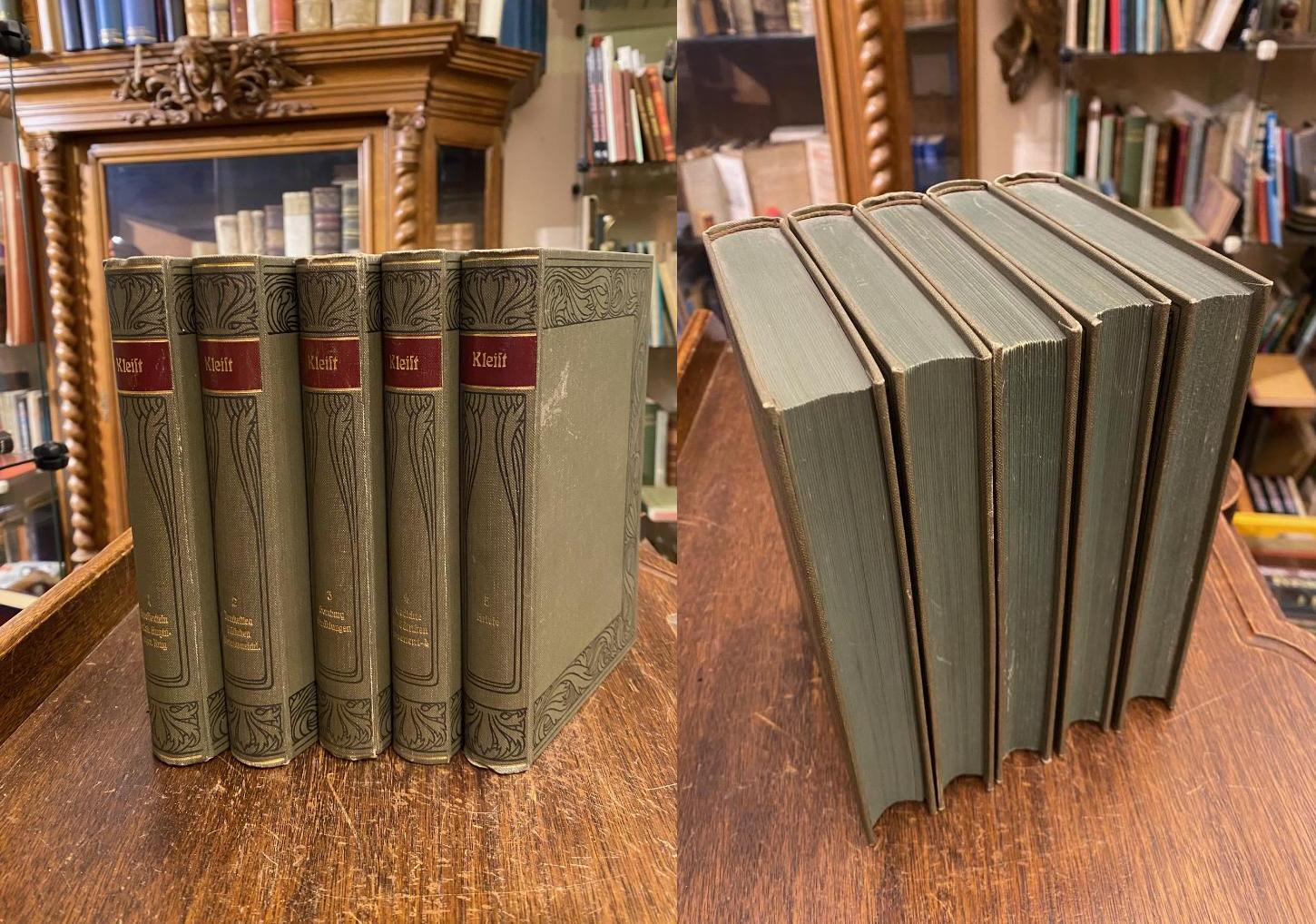 Kleist, Heinrich von (1777-1811). – Schmidt, Erich (Hrsg): Heinrich von Kleists Werke [in fünf Bänden]. Im Verein mit Georg Minde-Pouet und Reinhold Steig herausgegeben von Erich Schmidt. Kritisch durchgesehene und erläuterte Gesamtausgabe. 5 Bände in 5 [so komplett], Leipzig; Wien, Bibliographisches Institut, [1904/05]. 8°, 46,463; 466; 441; 411; 509 S., PorträtFrontispiz, 1 doppelseitiges gefaltetes HandschriftFaksimile, Bd 5: 2 weitere gefaltete BrieffFaksimile, einheitliche grüne Olnbde mit Jugendstil-Schmuckrahmen, rot geprägt RSchild, dreiseitiger GrünSchnitt, florale SchmuckVorsätze, nahezu ungelesen, schöne gepflegte Exemplare, [= Meyers Klassiker-Ausgaben : herausgegeben von Ernst Elster], [Sarkowski BI 22,30.– Hagen, Handbuch der Editionen, 340.1.– WG² 16].— Einzig abgeschlossene kritische Gesamtausgabe (Hagen).– Bandeinteilung Band 1: Kleists Leben und Werke.– Die Familie Schroffenstein.– Robert Guiskard.– Amphitryon.– Der zerbrochene Krug.— Band 2: Penthesilea.– Das Käthchen von Heilbronn.– Die Hermannschlacht.– Band 3: Prinz Friedrich von Homburg.– Erzählungen (Michael Kohlhaas.– Die Marquise von O…– Das Erdbeben in Chili.– Die Verlobung in St.Domingo.– Das Bettelweib von Locarno.– Der Findling.– Die heilige Cäcilie oder die Gewalt der Musik.– Der Zweikampf).– Band 4: Kleinere Gedichte.– Kleinere Schriften.– Lesarten Bd.1-4.– Band 5: Briefe.– Angang, Sachregister.