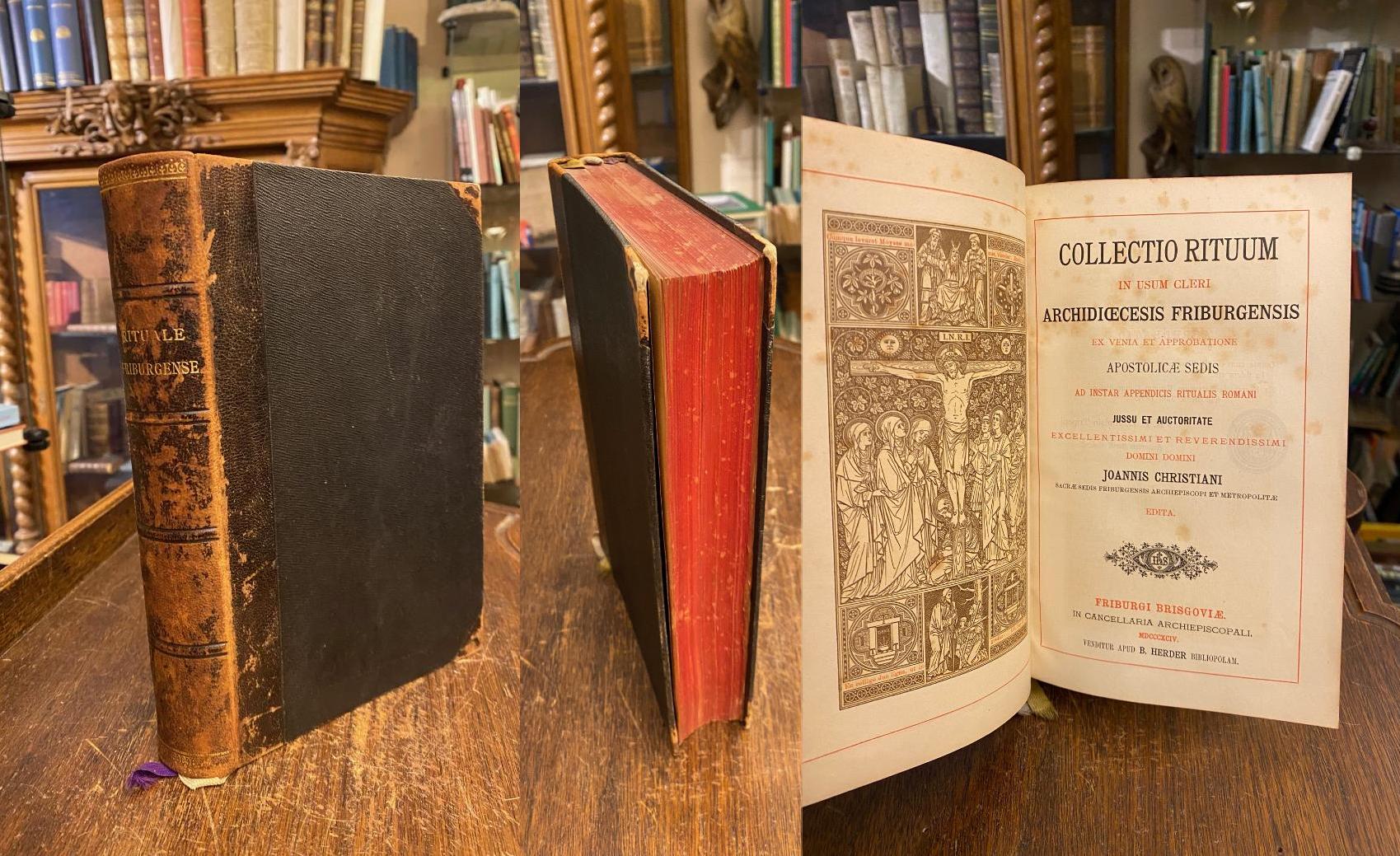 Rituale Friburgenses. – Roos, Johann Christian (Hrsg): Collectio Rituum in Usum Cleri Archidioecesis Friburgensis : ex Venia et Approbatione Apostolicae Sedis ad instar appendicis Ritualis Romani jussu et auctoritate excellentissimi et reverendissimi Domini Domini Joannis Christiani. Freiburg, B. Herder, 1894. 8° (23x15), XVI, 432, 92 S., rot/schwarz-Druck, rot rubriziert, mit Frontispiz sowie teils ganzseitigen Illustrationen und Kapitelvignetten (Beuroner Schule), OHLdr, dreiseitiger Rotschnitt, SchmuckVorsätze, Leder deutlich berieben, vereinzelt etwas stockfleckig, wenige radierbare dünne Bleistiftanmerkungen, gutes festes Exemplar,