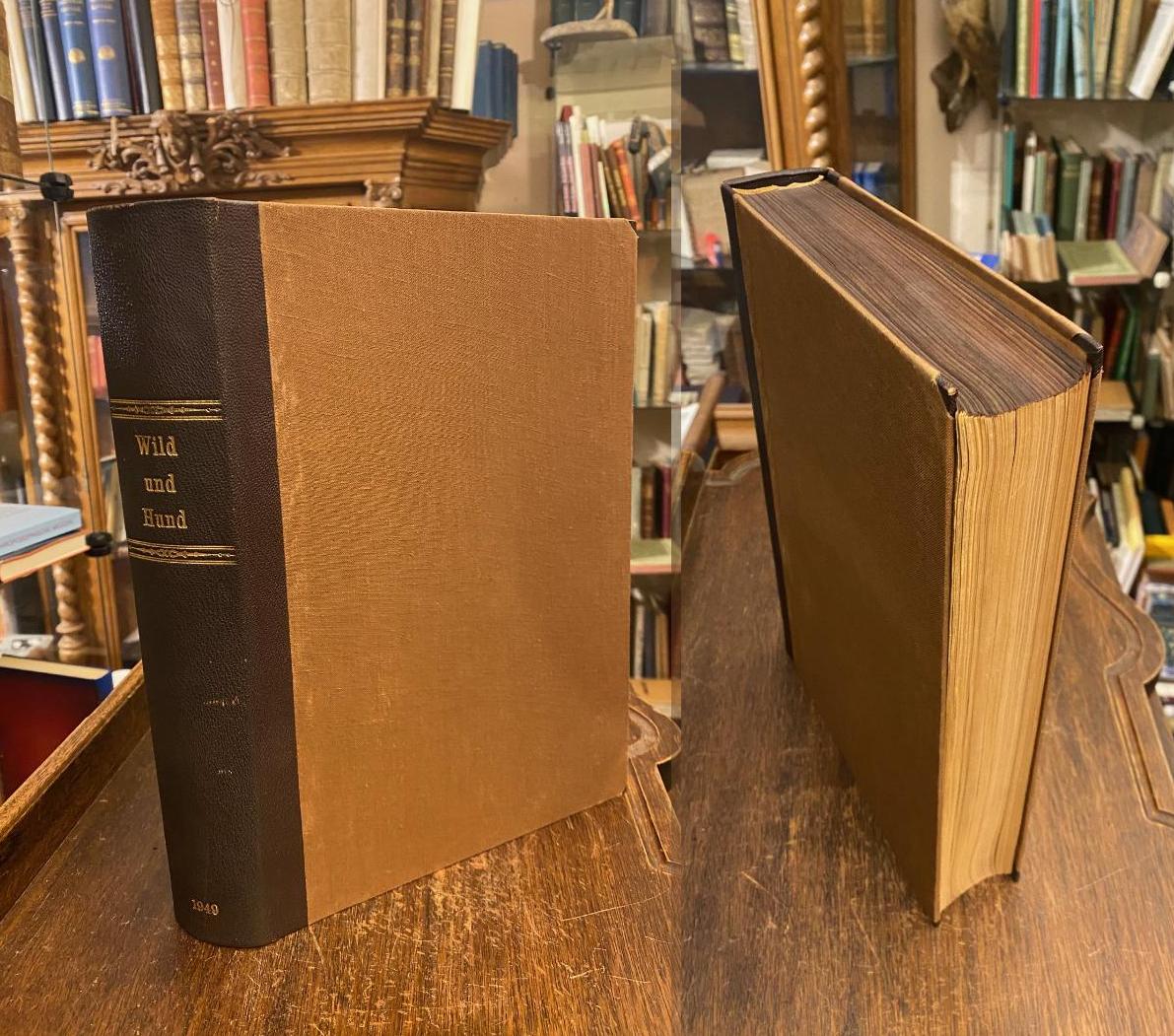Wild und Hund 1949/1950 – Jahrgang 52 : Heft 1 (Anfang April 1949) – Heft 24 (März 1950) : Vereinigt mit St.Hubertus – Der Heger – Jagd und Hege. Hamburg und Berlin, Verlag Paul Parey, 1949 – 1950. 4° (30x21), 386, 394 S., (Innen- und Außenteil getrennt paginiert und wechselnd wie erschienen), mit zahlr. Abb. und den farb Umschläge, brauner Halbleder mit goldRückentitel und Jahreszahl 1949, Leder gering berieben, sauber und gepflegt, vollständiger 52. Jahrgang mit 24 fortlaufenden Heften der sehr seltenen frühen Nachkriegsausgaben.– mit wirrer Seitenzählung (Innen- und Außenteil abwechseln gebunden, wie erschienen).–