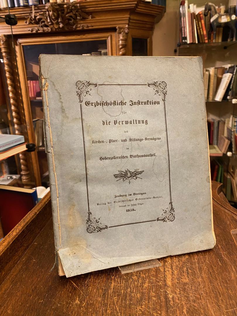 Erzbischöfliche Instruktion für die Verwaltung des Kirchen-, Pfarr- und Stiftungs-Vermögens im Hohenzollernschen Bisthumsantheil. Freiburg, Verlag der Erzbischöflichen Ordinariats-Kanzlei / Joseph Dilger (Druck), 1858. 4° (26x21), 90 S., OKart (Brosch) mit Schmuckrahmen, Umschlag angeschmutzt und etwas lädiert, sonst fest und sauber,